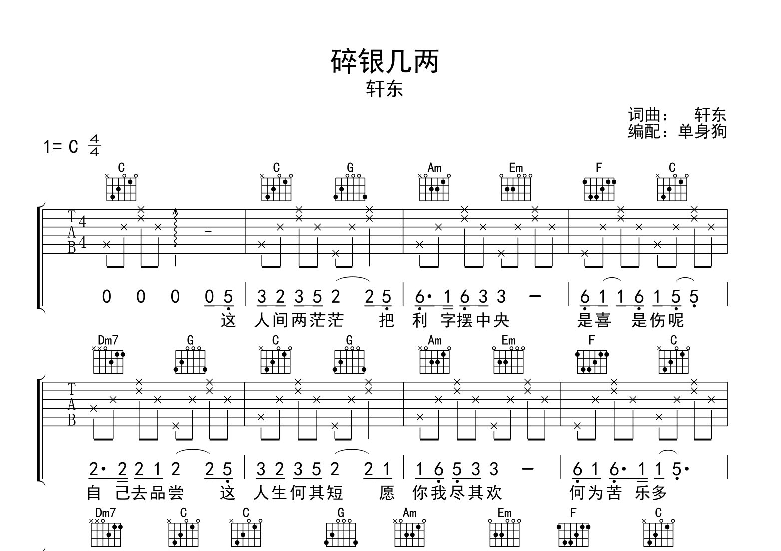 碎银几两吉他谱 - 轩东 - C调吉他弹唱谱