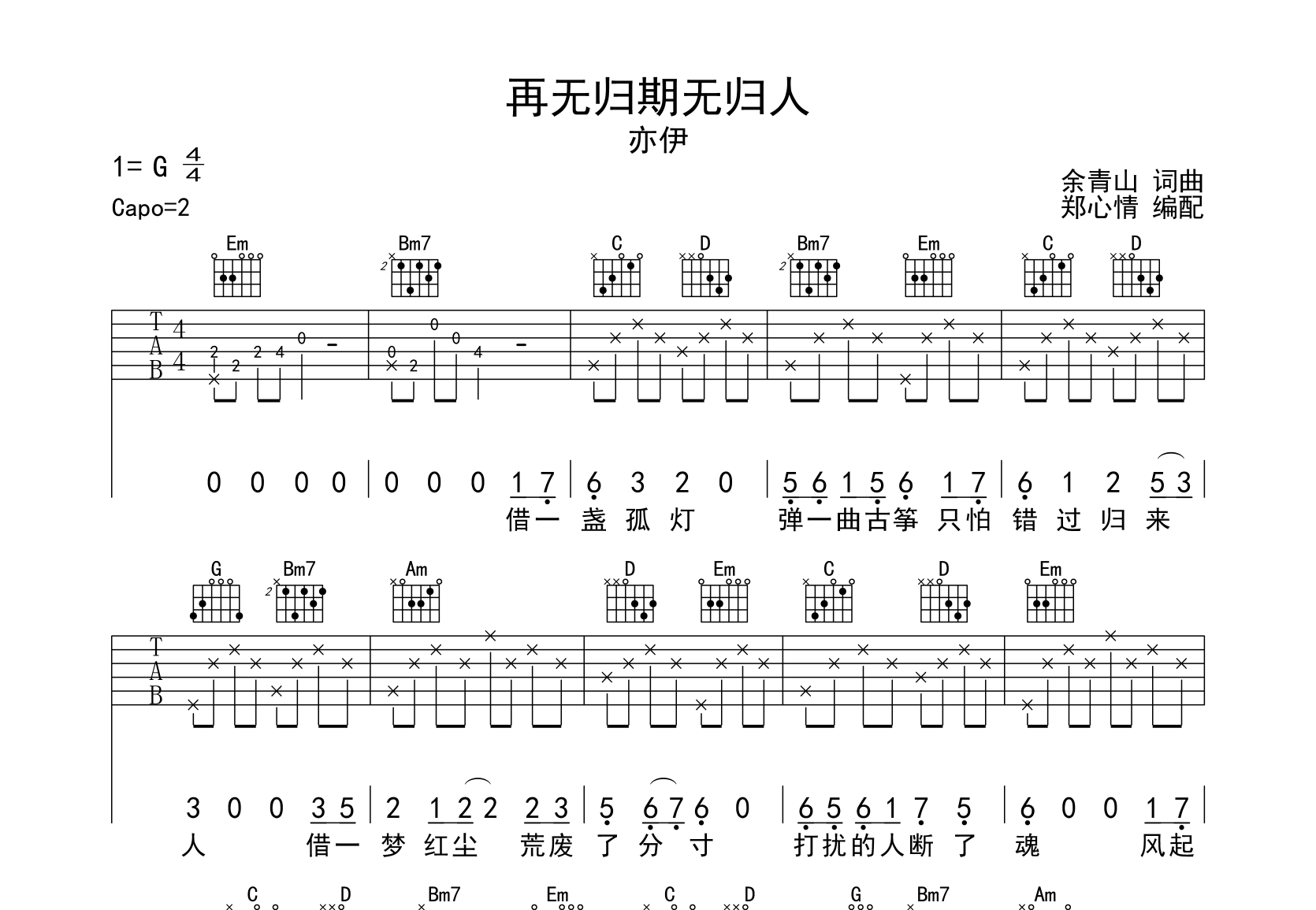曲谱介绍: 奕伊《再无归期无归人》吉他谱,由创作者郑心情制谱,共两张高清六线谱图例,选用G调指法编配,原调为A调,变调夹夹2品弹唱原调,节奏4/4拍,难度初级较简单。