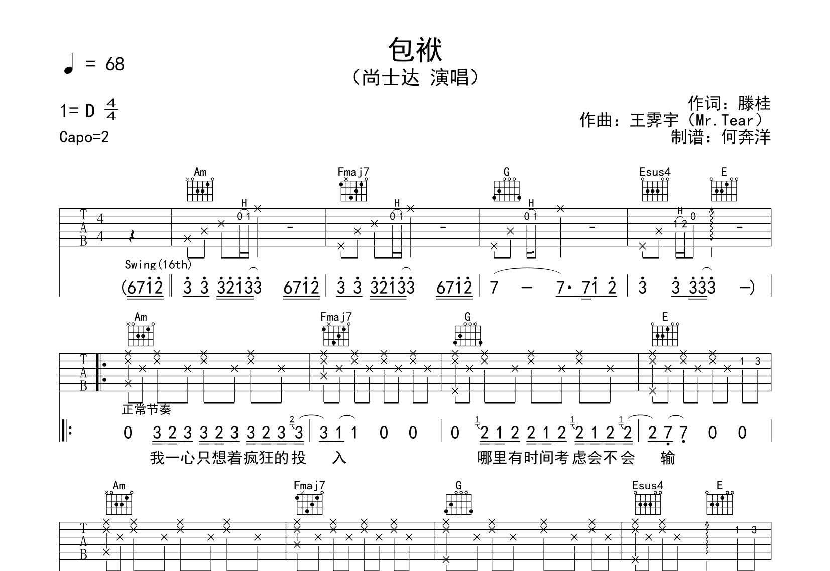 曲谱介绍: 尚士达《包袱》吉他谱,由何奔洋制谱,共两张高清六线谱,本谱为C调和弦指法编配,变调夹建议夹2品弹唱,节奏4/4拍,速度68BPM,随谱附《包袱》吉他弹唱演示音频,弹唱难度初级简单。 吉他弹唱预览音频: