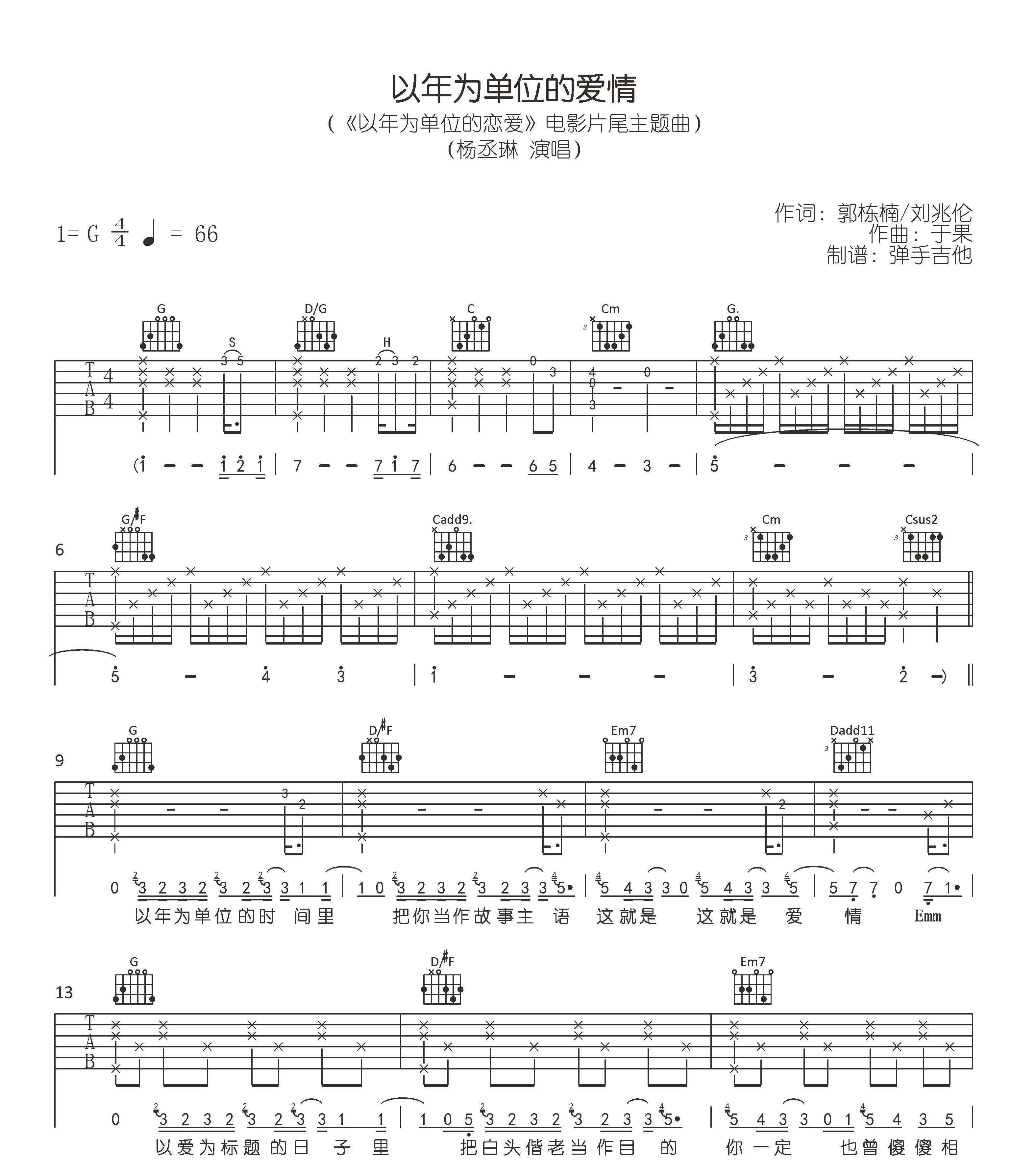 曲谱介绍: 由弹手吉他制谱的《以年为单位的爱情》吉他谱,共三张高清六线谱图例,本谱为G调吉他弹唱谱,速度66BPM,节奏4/4拍,弹唱难度初级简单。