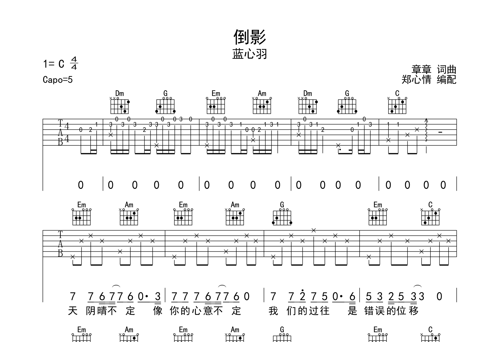 倒影吉他谱 - 蓝心羽 - C调吉他弹唱谱