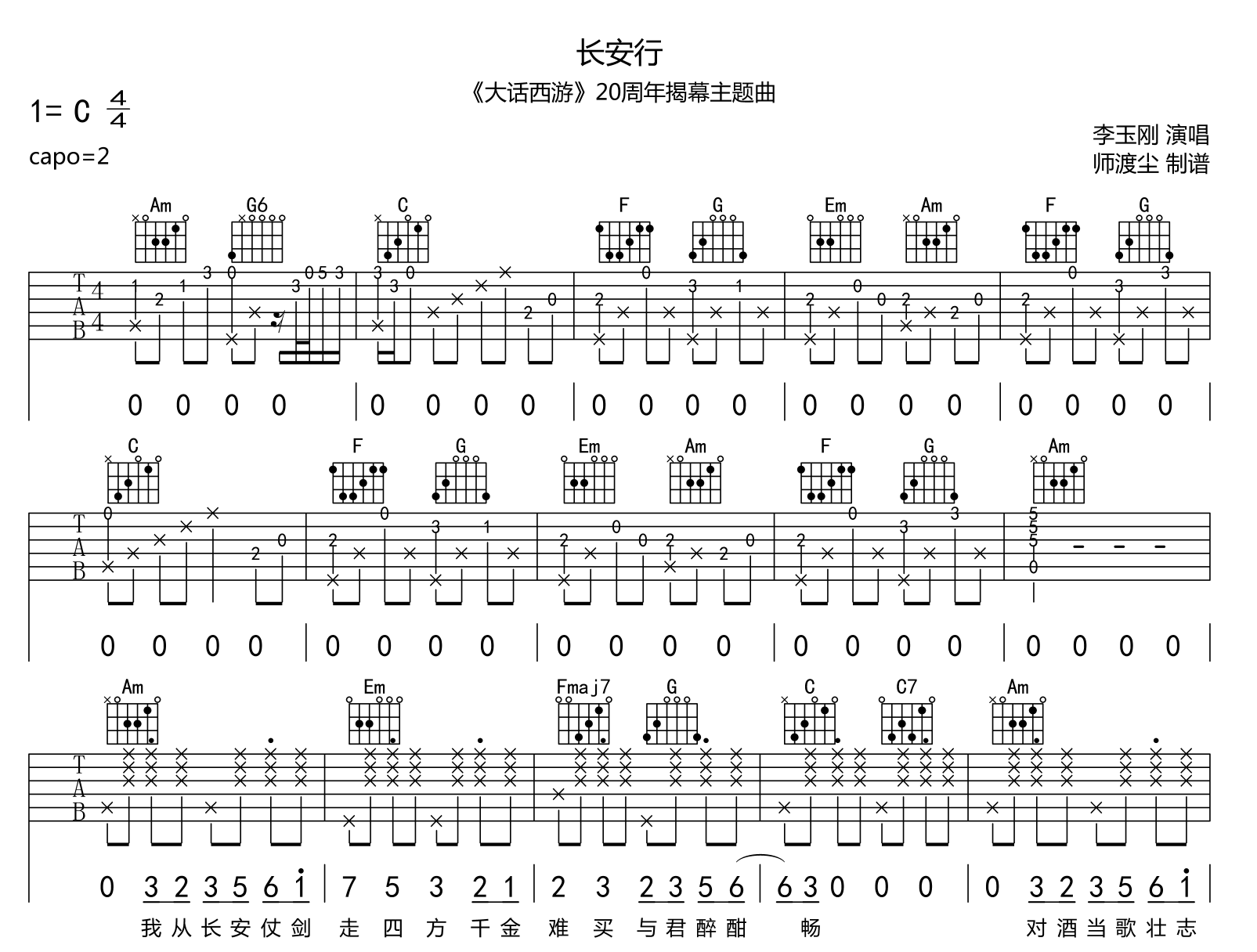 长安行吉他谱 - 李玉刚 - C调吉他弹唱谱