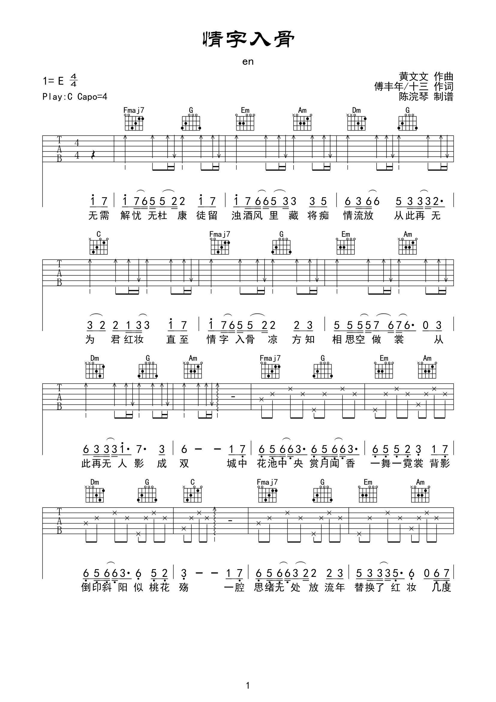 曲谱介绍: 《情字入骨》吉他谱,由陈浣琴制谱,共三张高清六线谱图例,本谱为C调编配,变调夹夹4品弹唱原调E调,节奏4/4拍,扫弦节奏贯穿全曲,难度较简单。