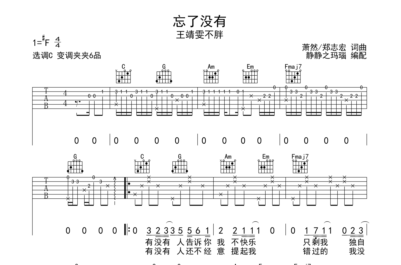忘了没有吉他谱 - 王靖雯 - C调吉他弹唱谱