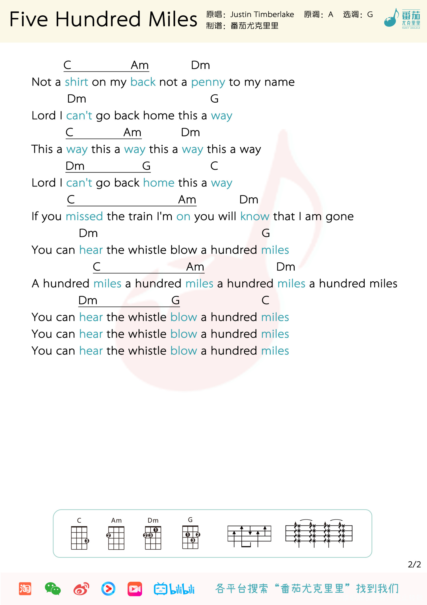 曲谱介绍: 如果The Beatles的《Yesterday》是被翻唱次数最多的独唱歌曲的话,这首《500 miles》,则完全有可能是被翻唱次数最多的重唱歌曲。最为出名的就是Peter, Paul & Mary(三重唱组合)和The Brothers Four(四重唱组合)的演绎,他们和Joan Baez(代表作为那首著名的“Donna Donna”)是美国60年代民歌运动的重要代表。他们歌曲的共同风格就是旋律优美,自然清新,同时又富有哲理,几十年来被人们传唱,经久不衰。 指弹演示 指弹教学 指弹曲谱   弹唱曲谱
