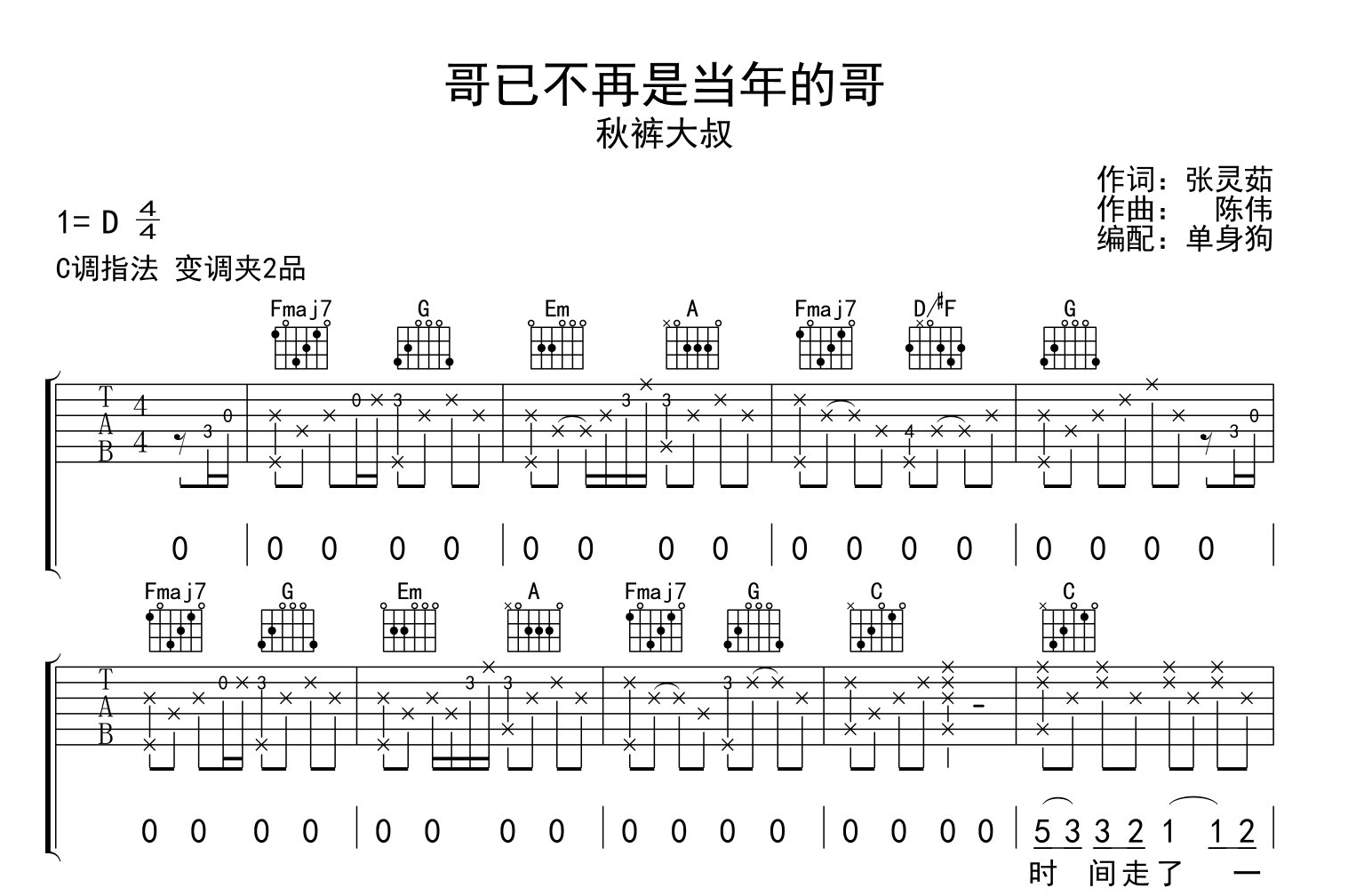 曲谱介绍: 秋裤大叔《哥已不再是当年的哥》吉他谱,共有三张高清六线谱图例,本谱为C调指法编配,变调夹可以夹在2品处弹唱,节奏4/4拍,难度较为简单。