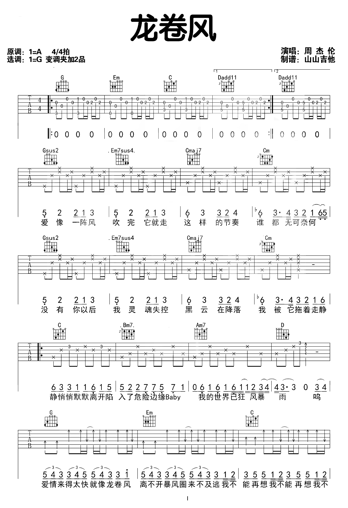 曲谱介绍: 由山山吉他制谱分享的《龙卷风》吉他谱,共三张高清六线谱图例,本谱为G调吉他弹唱谱,变调夹可夹2品处弹唱原调A调,节奏4/4拍,随谱可参考老师《龙卷风》吉他弹唱演示视频,难度中级。 《龙卷风》吉他弹唱演示视频