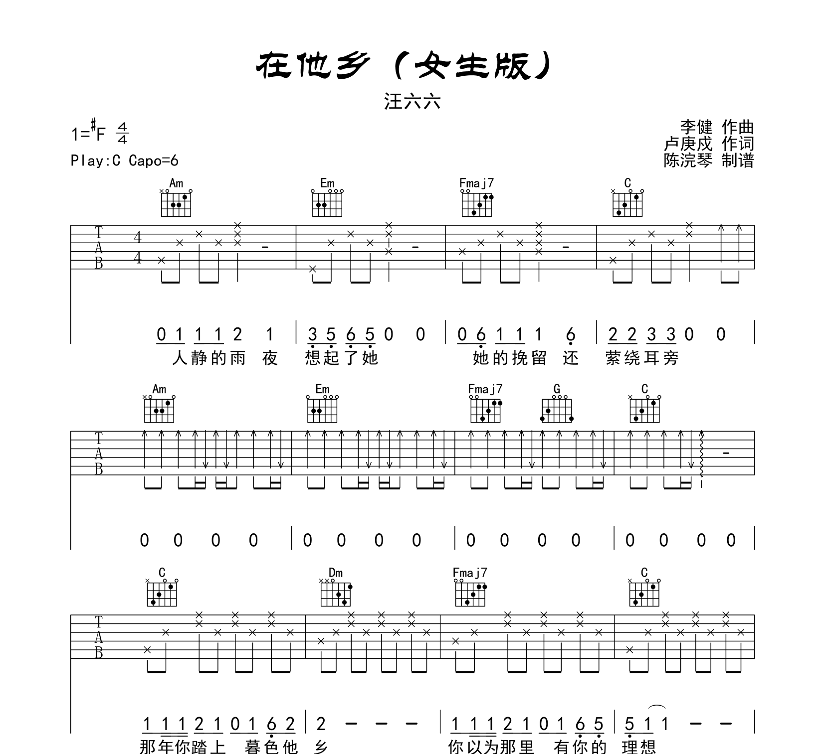 曲谱介绍: 汪六六《在他乡》吉他谱【女生版】,由创作者断湘弦制谱,共三张高清六线谱图例,本谱为C调编配吉他谱,变调夹夹6品弹唱#F调,节奏4/4拍,难度初级较简单。