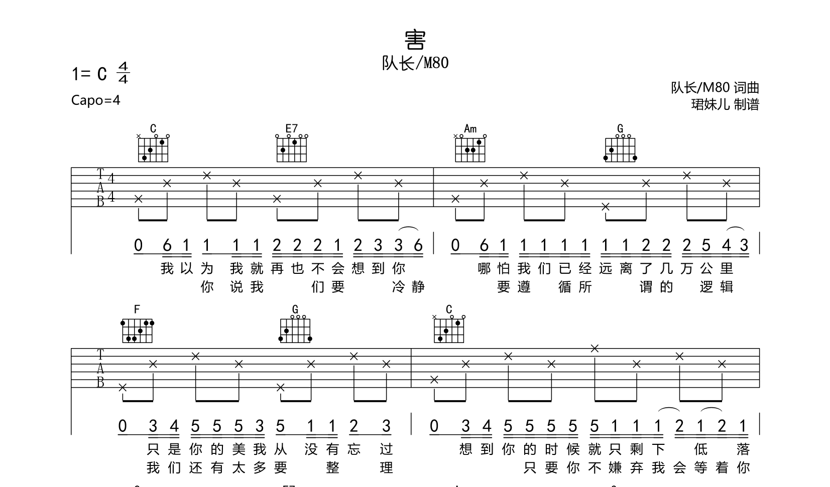 曲谱介绍: 队长/M80《害》吉他谱_,由创作者珺妹儿制谱,共两张高清六线谱图例,本谱采用C调指法编配,弹唱建议变调夹4品,速度85BPM,难度较简单,易上手。