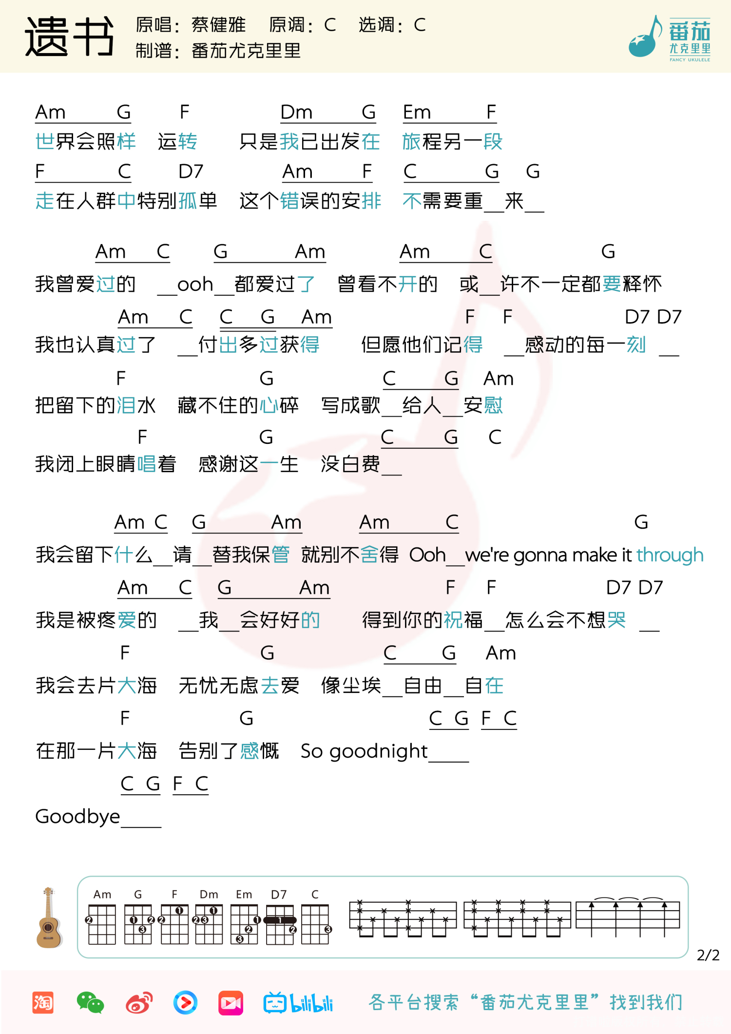 曲谱介绍: 蔡健雅的歌声一想起总会感受到独属于她的歌唱魅力,一封《遗书》不是绝望,而是埋葬过去,带着美好祝福,去追逐那片属于自己的星辰大海。     弹唱曲谱