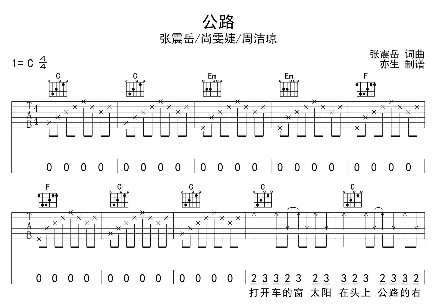 曲谱介绍: 张震岳/尚雯婕/周洁琼《公路》吉他谱,由创作者亦生制谱分享,共三张高清六线谱图例,本谱采用C调和弦指法编配,节奏为4/4拍,速度为120拍每分钟,弹唱建议变调不夹,难度较简单。