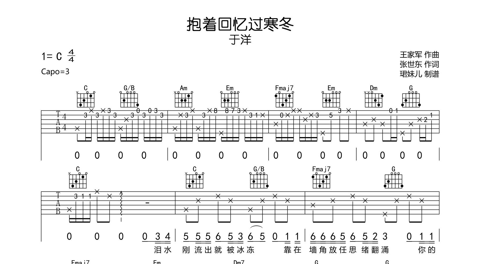 曲谱介绍: 《抱着回忆过寒冬》吉他谱,由创作者珺妹儿制谱,共两张高清六线谱图例,本谱采用C调指法编配,弹唱建议变调夹3品,速度85BPM,节奏4/4拍,难度较简单,易上手。