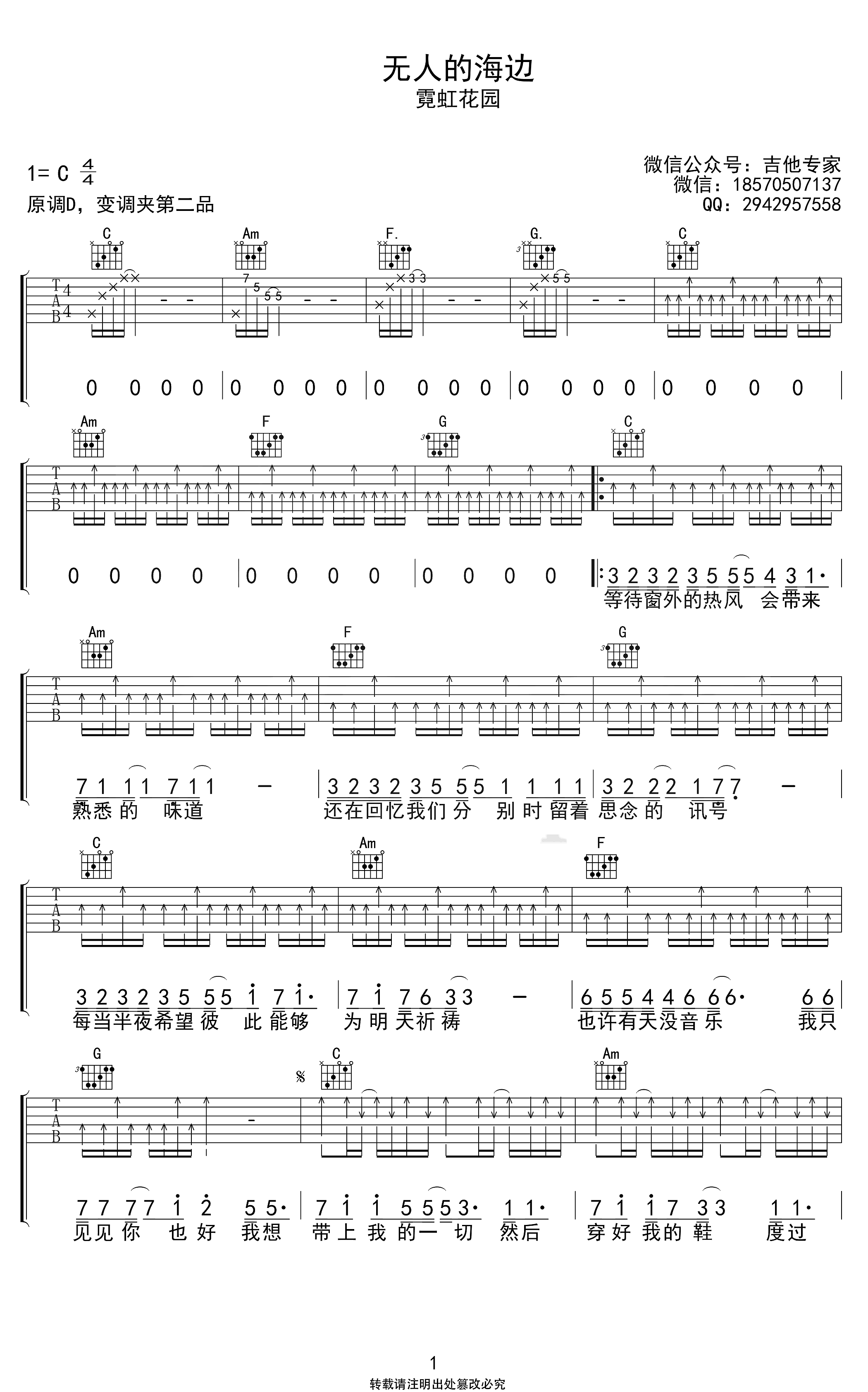 曲谱介绍: 由吉他专家制谱的《无人的海边》吉他谱,共有两张高清六线谱图例,本谱为C调吉他弹唱谱,建议变调夹夹2品弹唱原调,节奏4/4拍。