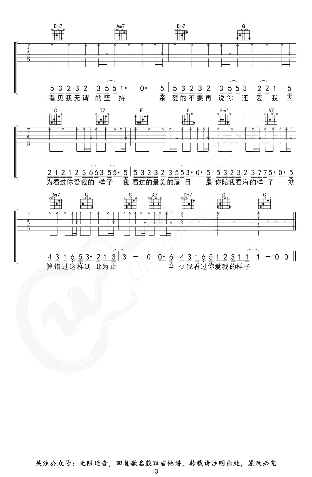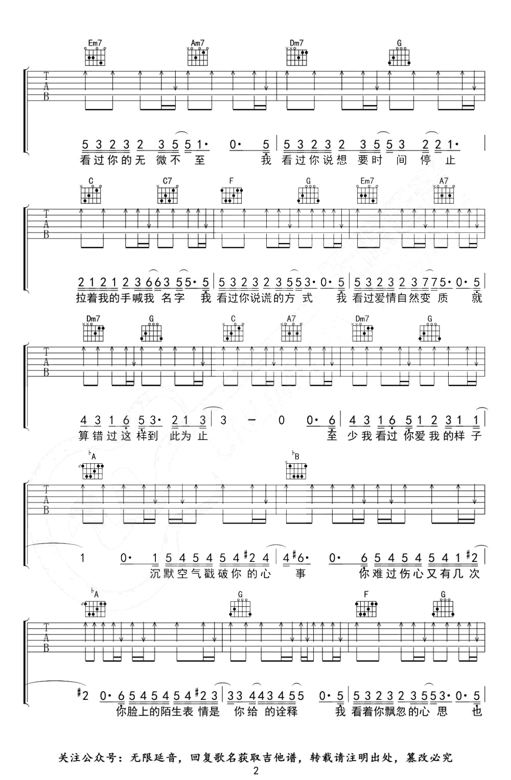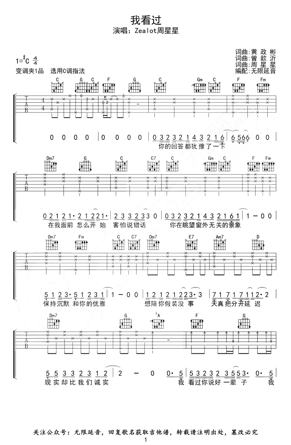 曲谱介绍: 《我看过》吉他谱,原调升C,变调夹一品,选用C调指法,三张图片六线谱。