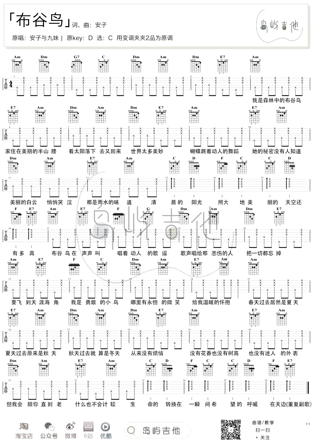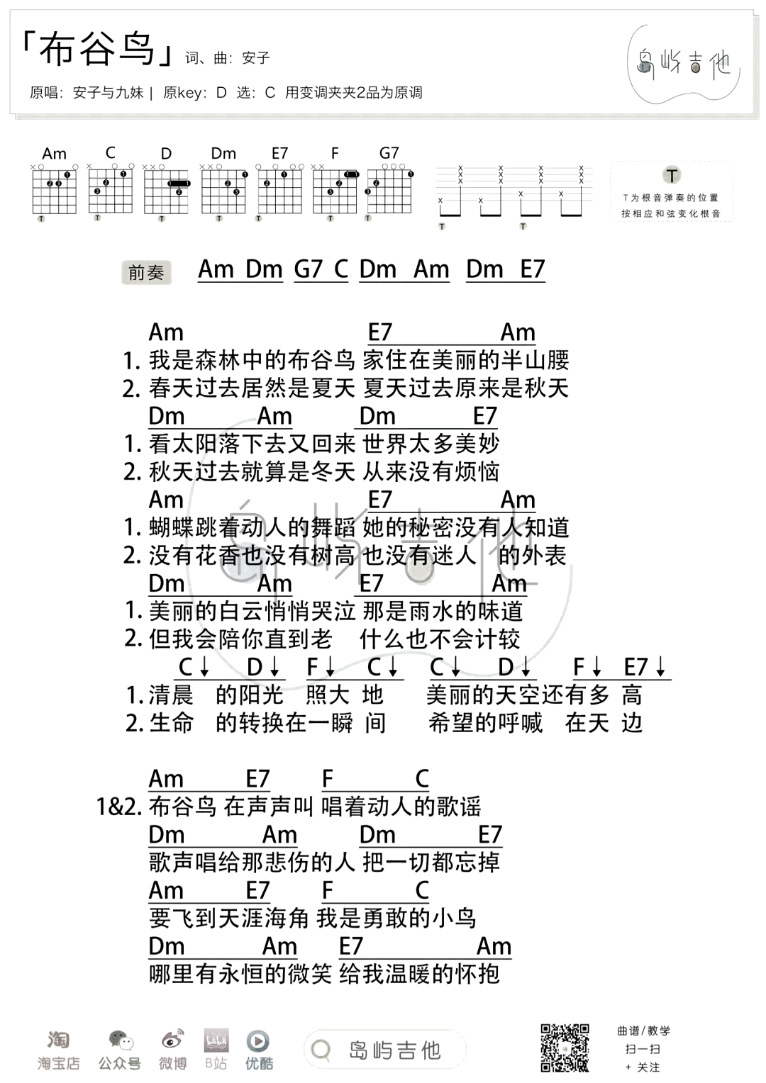 布谷鸟吉他谱 - 安子与九妹 - C调吉他弹唱谱