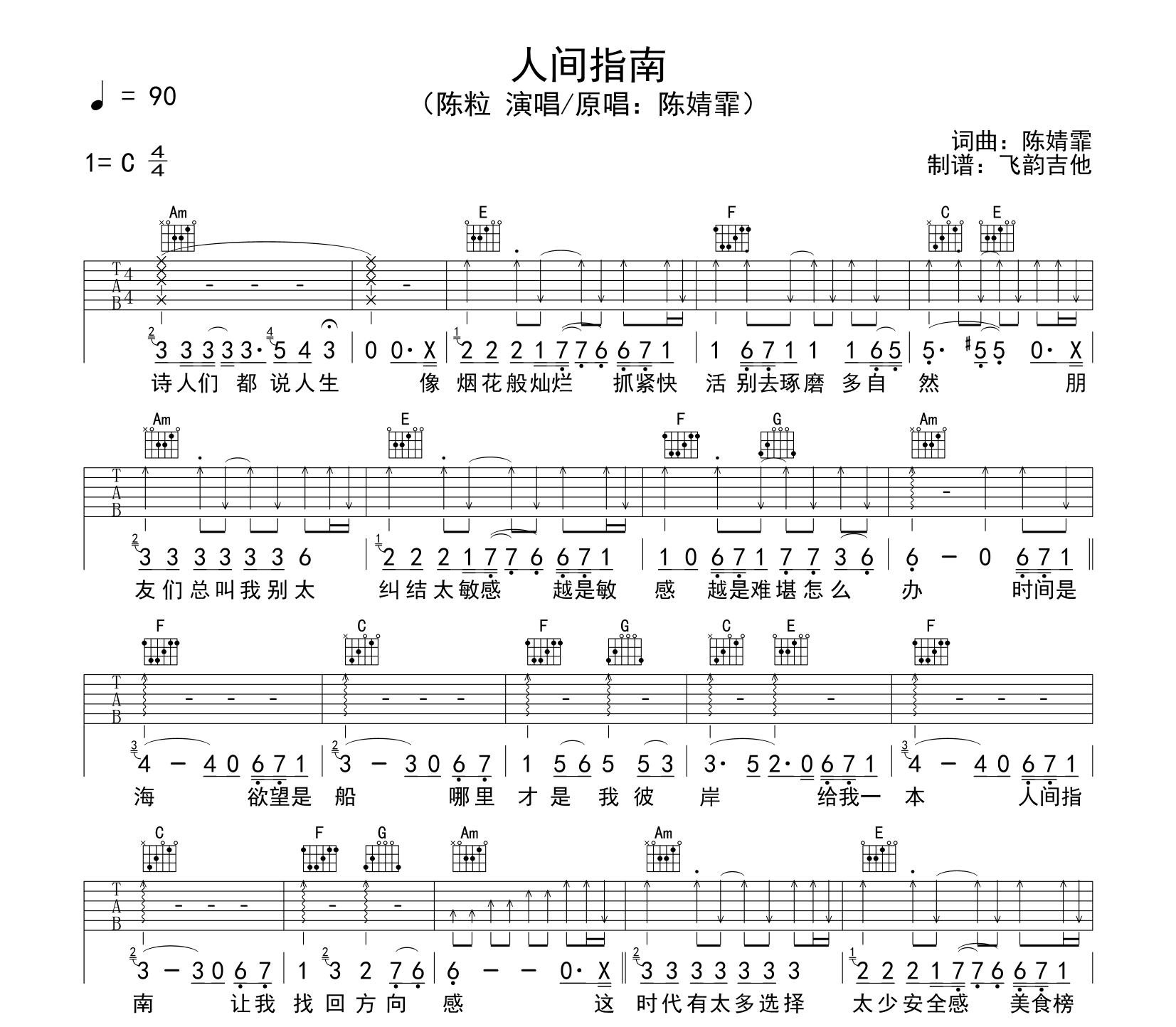 曲谱介绍: 陈粒《人间指南》吉他谱,陈婧霏创作并原唱的歌曲,《人间指南》吉他弹唱谱,选用C调,标准调音可不用变调夹,速度90BPM,难度初级简单,节奏4/4拍,本谱由@飞韵吉他制谱上传。