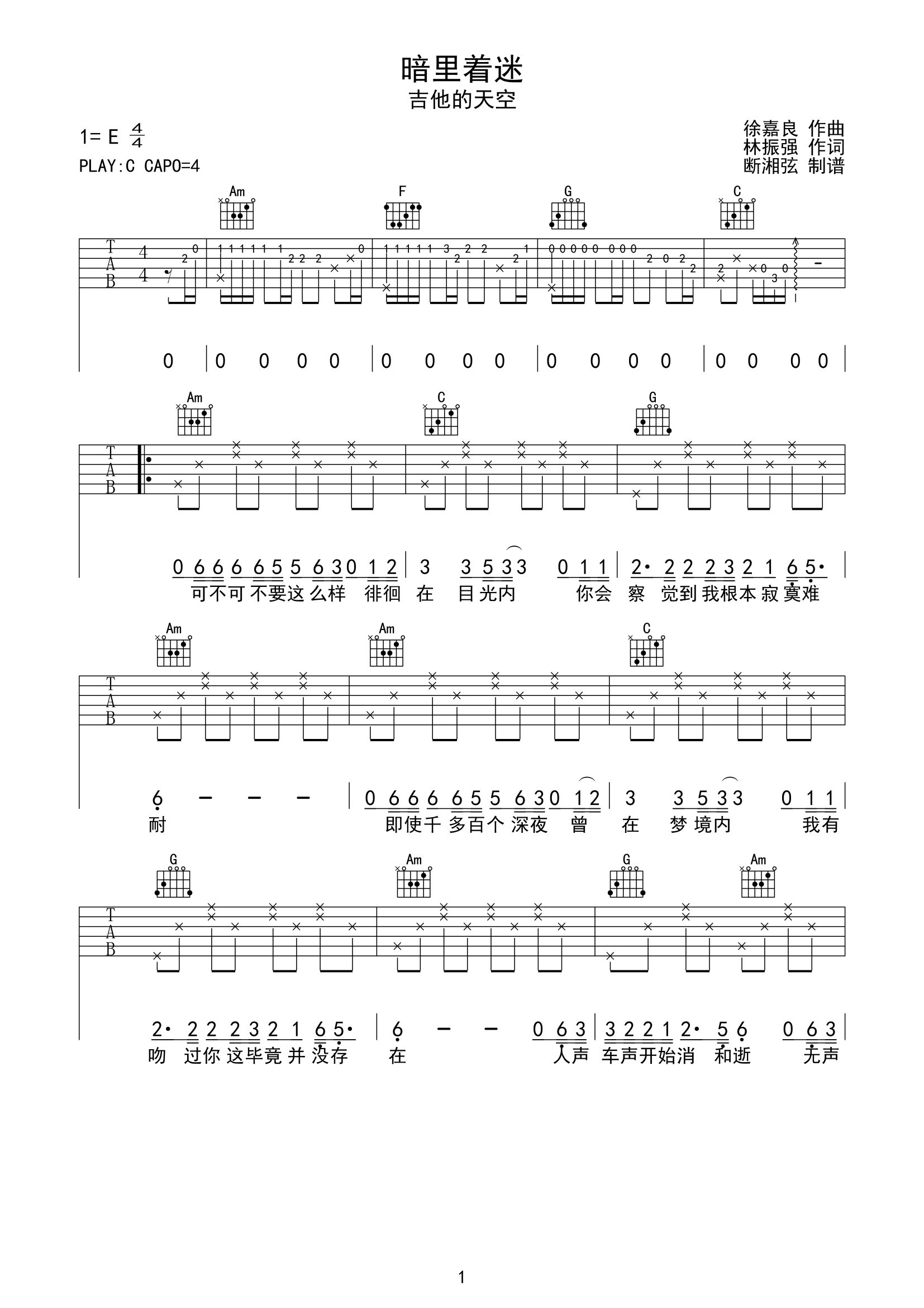 暗里着迷吉他谱 - 吉他的天空 - C调吉他弹唱谱