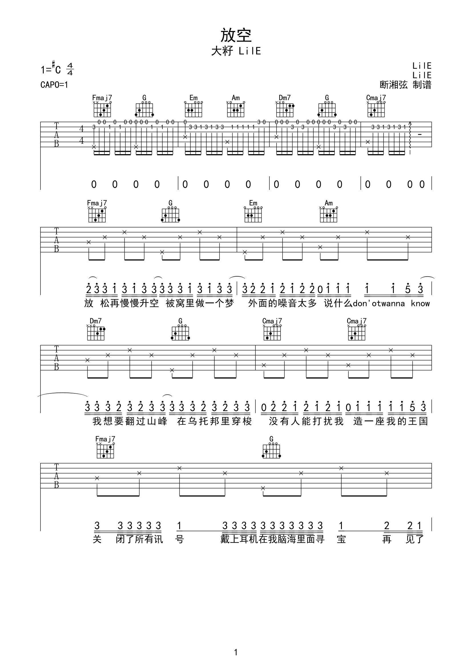 曲谱介绍: 《放空》这首曲谱,总共3张高清图片,选用C调,原调#C,变调夹推荐夹1品,弹唱有一定难度,主要还是在节拍的处理上。