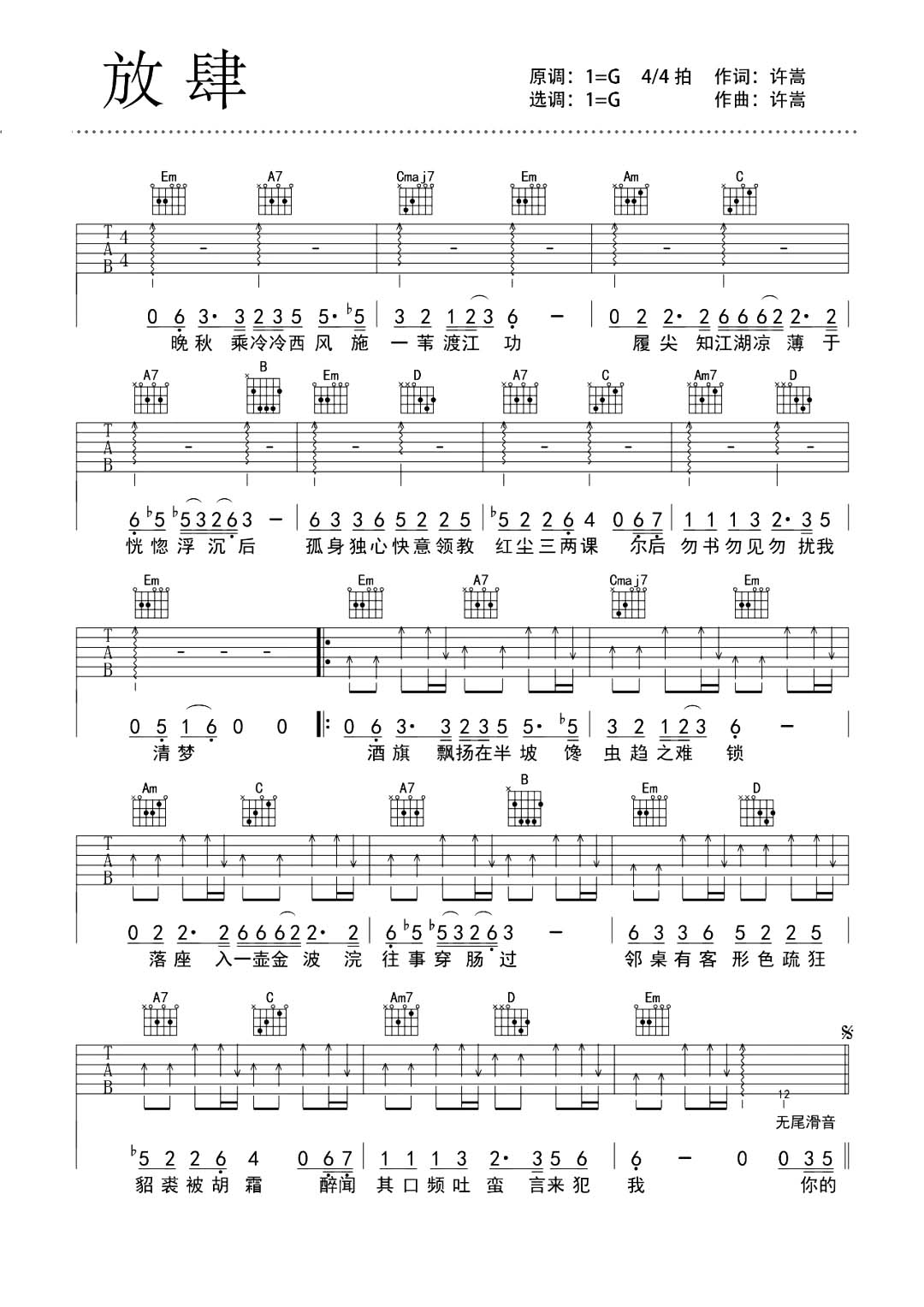 放肆吉他谱 - 许嵩 - G调吉他弹唱谱