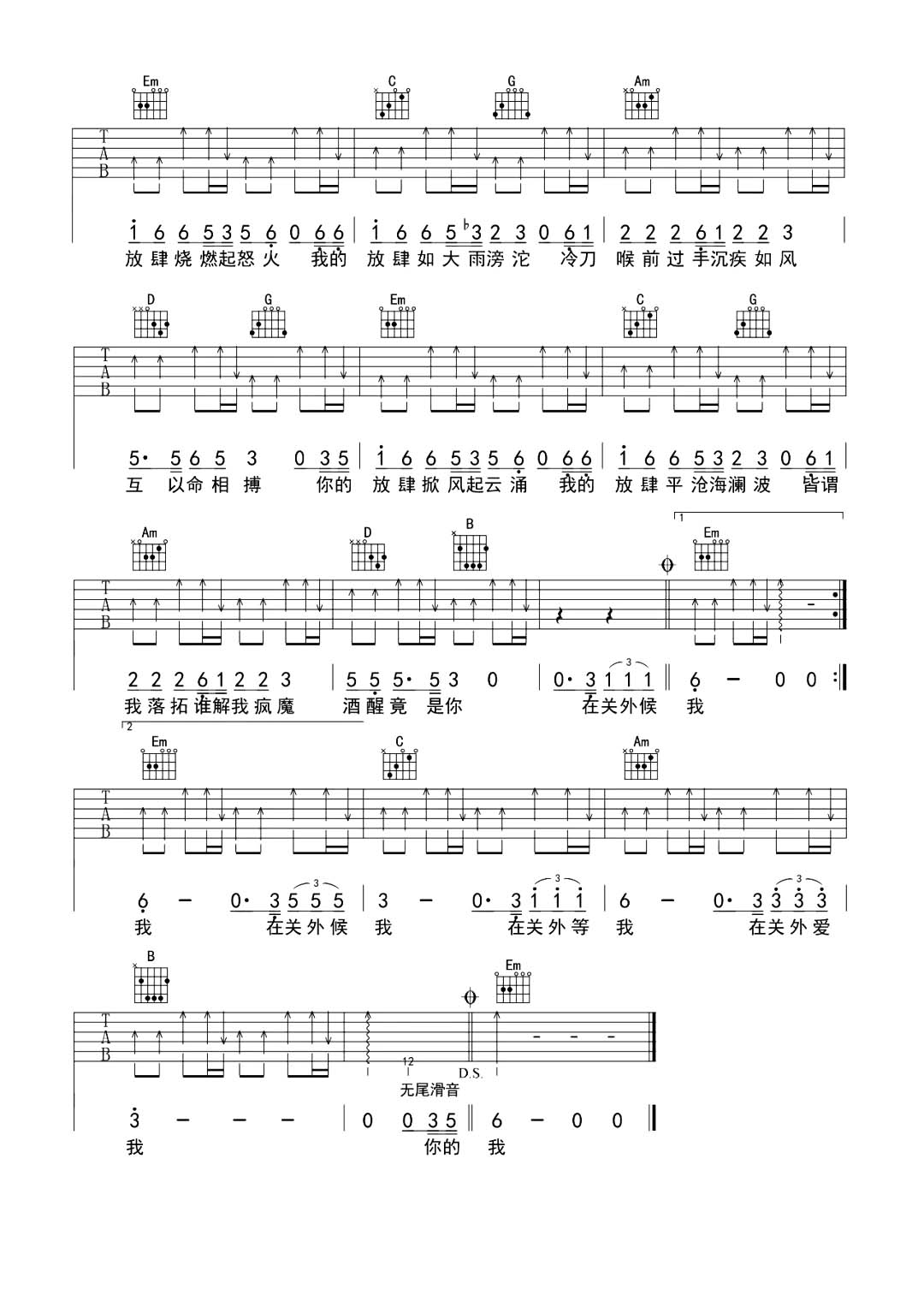 曲谱介绍: 《放肆》这首曲谱总共2张高清图片谱,原调G调,标准调音,不用变调夹。