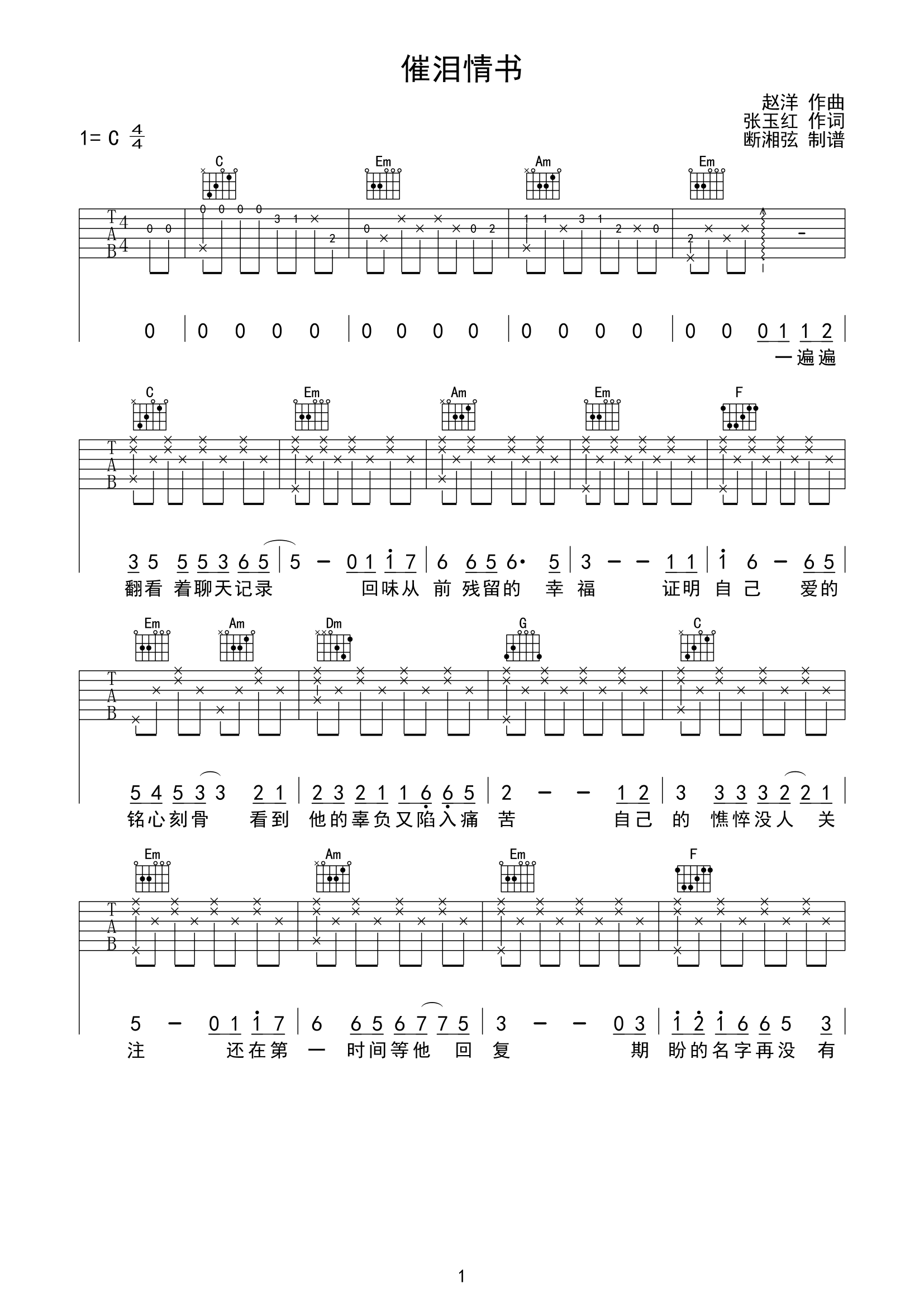 曲谱介绍: 《催泪情书》这首曲谱总共3张高清图片谱,选用C调指法编配,包含完整的前奏,弹唱的时候可不夹变调夹。