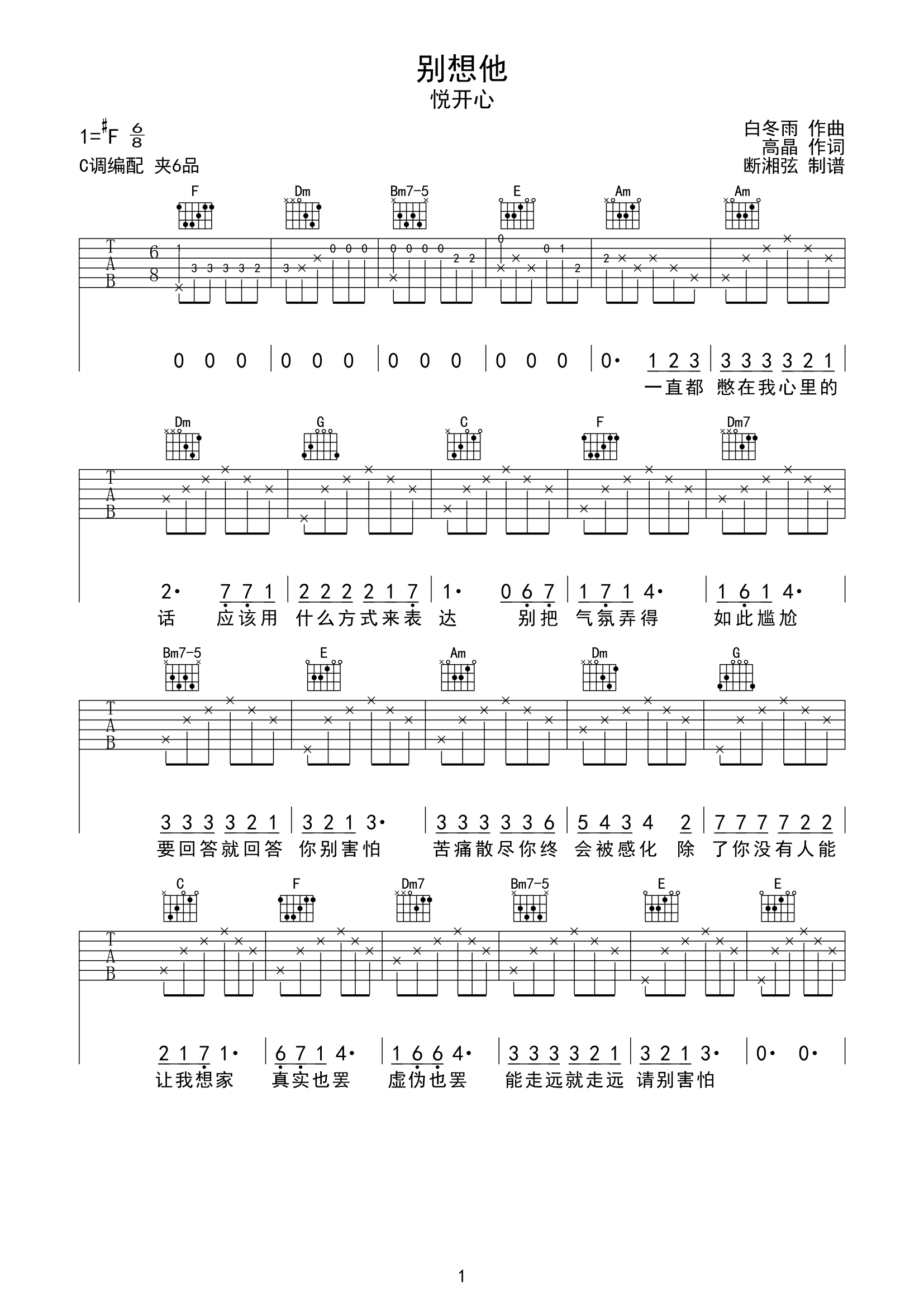 曲谱介绍: 《别想他》这首曲谱总共3张高清图片谱,原调#F,选用C调指法,变调夹推荐夹6品弹唱,整体难度很简单。