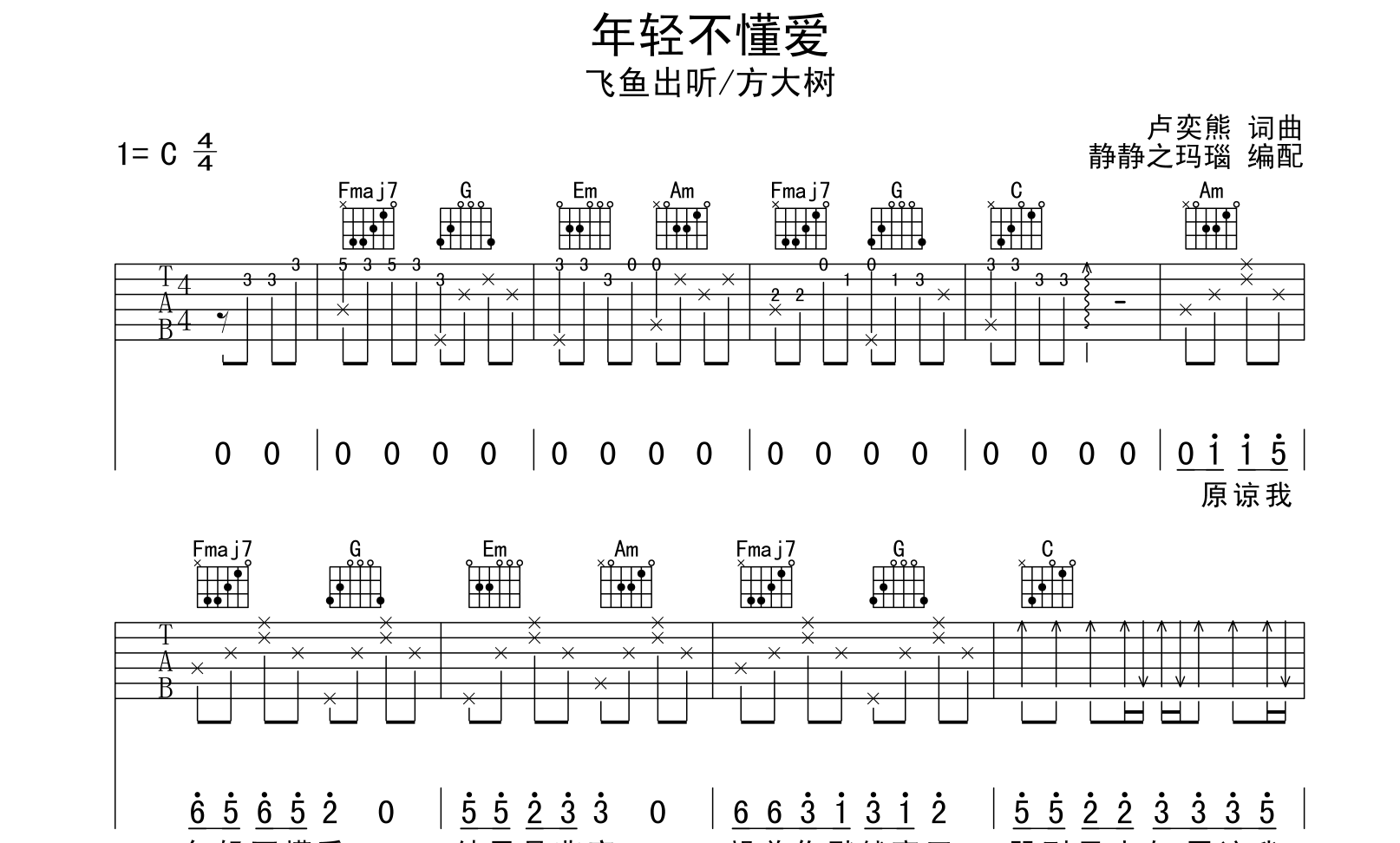 年轻不懂爱吉他谱 - 飞鱼出听/方大树 - C调吉他弹唱谱 - 原版