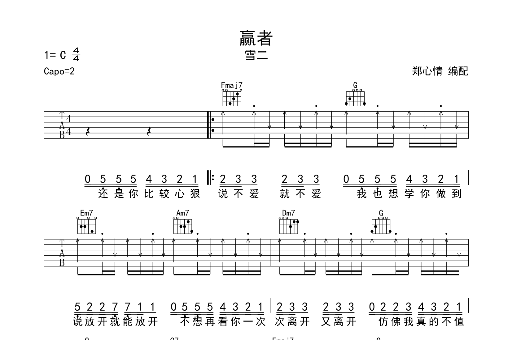 曲谱介绍: 赢者吉他谱,共3张高清图片谱,C调指法编配,原调为D调,变调夹夹2品为原调,本首谱子的关键点在于制音的应用,弹唱难度适中,建议按小节熟练掌握节奏,由@郑心情编配制谱。
