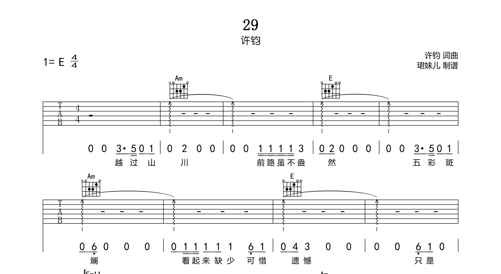曲谱介绍: 许钧《29》吉他谱,总共3张高清图片谱,本谱采用E调指法编配,节拍4/4拍,速度80BPM,弹唱难度较简单,由本站创作者@珺妹儿编配制谱。