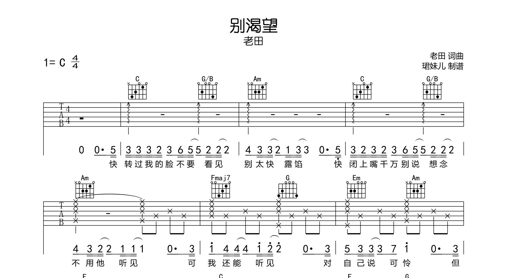 别渴望吉他谱 - 老田 - C调吉他弹唱谱