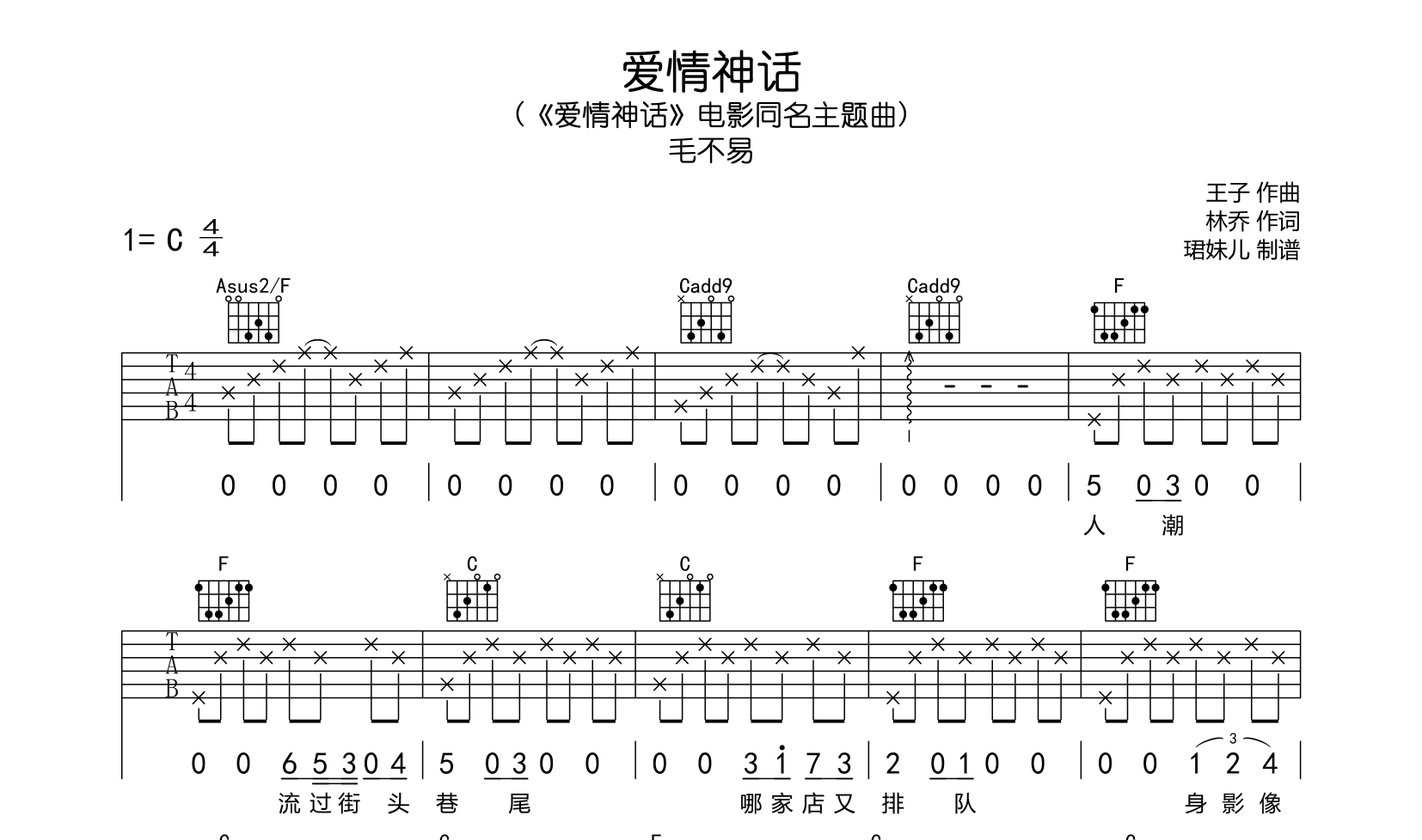 曲谱介绍: 毛不易爱情神话吉他谱,由珺妹儿制谱,总共3张高清图片谱,本谱采用C调指法编配,标准调音可不用变调夹,速度85BPM每分钟,包含完整的前奏,弹唱难度较简单。