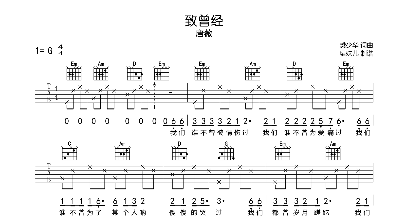 致曾经吉他谱 - 唐薇 - G调吉他弹唱谱