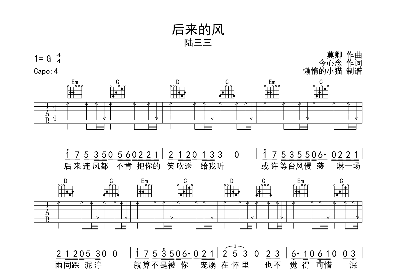 曲谱介绍: 后来的风吉他谱,总共3张高清图片谱,原调为B调,使用G调指法编配 原调夹四品弹唱,速度每分钟65~70拍,节奏4/4拍,主要以扫弦节奏弹唱,难度较为简单,本谱由创作者懒惰的小猫制谱。