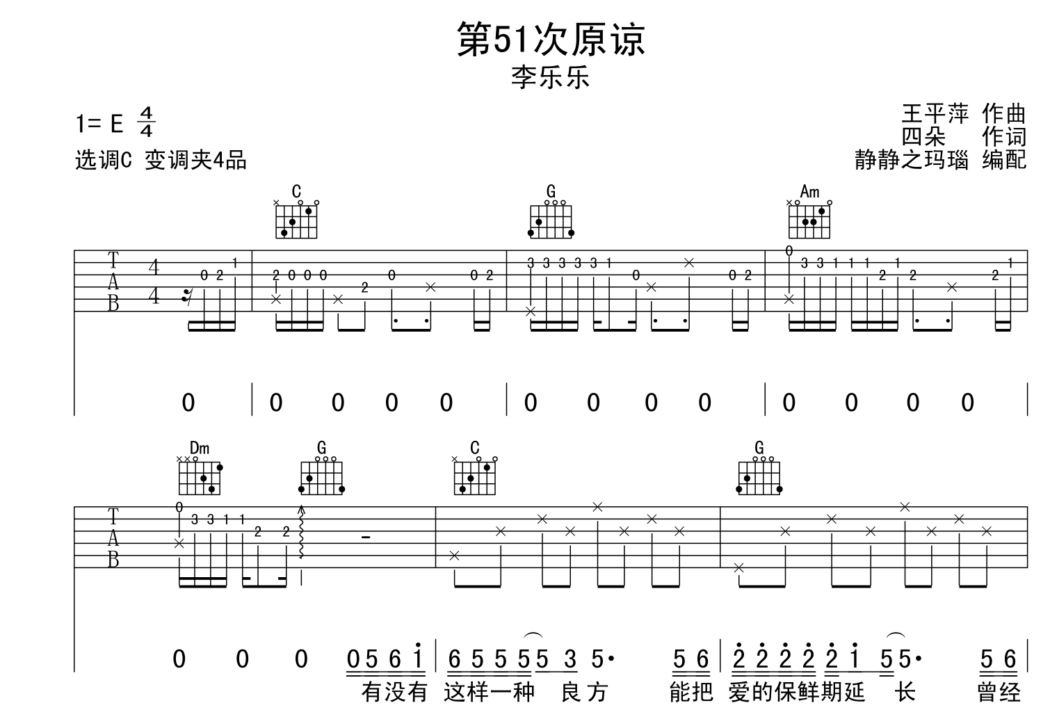 曲谱介绍: 第51次原谅吉他谱,由@静静之玛瑙制谱,总共3张高清图片谱,本谱采用C调编配,原调为E调,弹唱建议变调夹4品,包含完整的前奏,节奏4/4拍,曲速54BPM每分钟,弹唱难度较为简单。