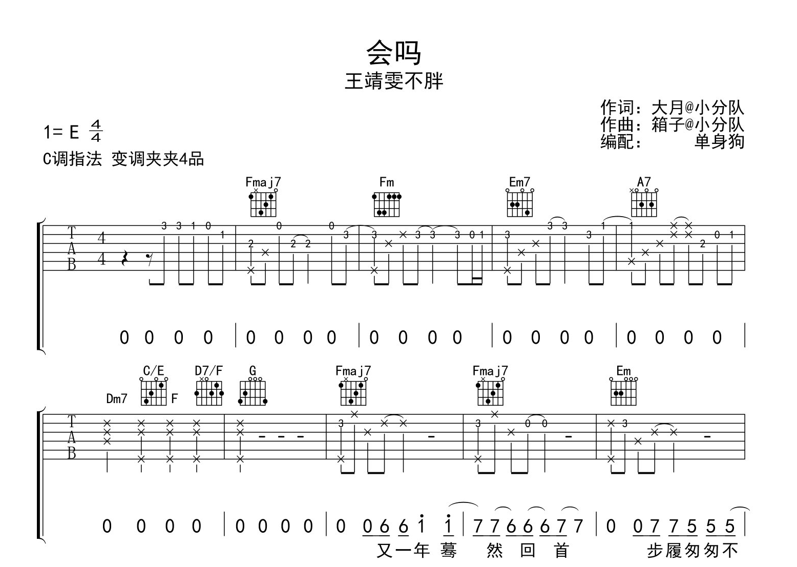 曲谱介绍: 会吗吉他谱,总共3张图片谱,原调是E调,选用C调指法,变调夹建议夹4品弹唱,按原版还原包含前奏,分解和弦部分细节较多需要注意,弹唱难度适中,本谱由制谱师单身狗制谱。