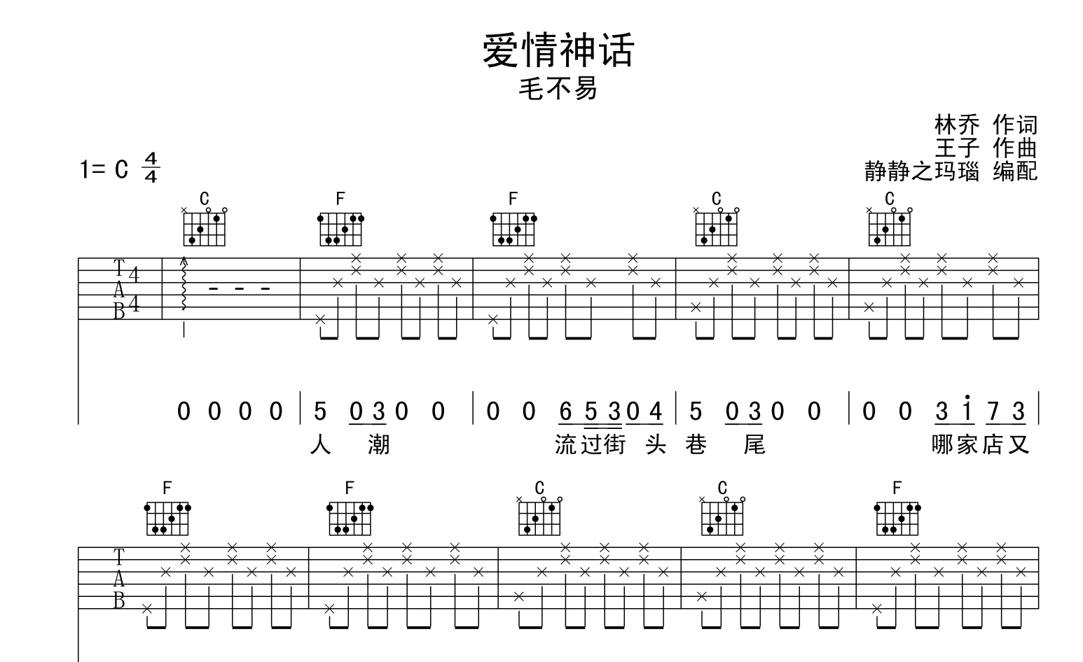曲谱介绍: 爱情神话吉他谱,总共3张高清图片谱,本谱用C调编配,节奏4/4拍,曲速95BPM每分钟,弹唱建议不夹变调夹,弹唱难度简单,吉他谱由静静之玛瑙制谱。