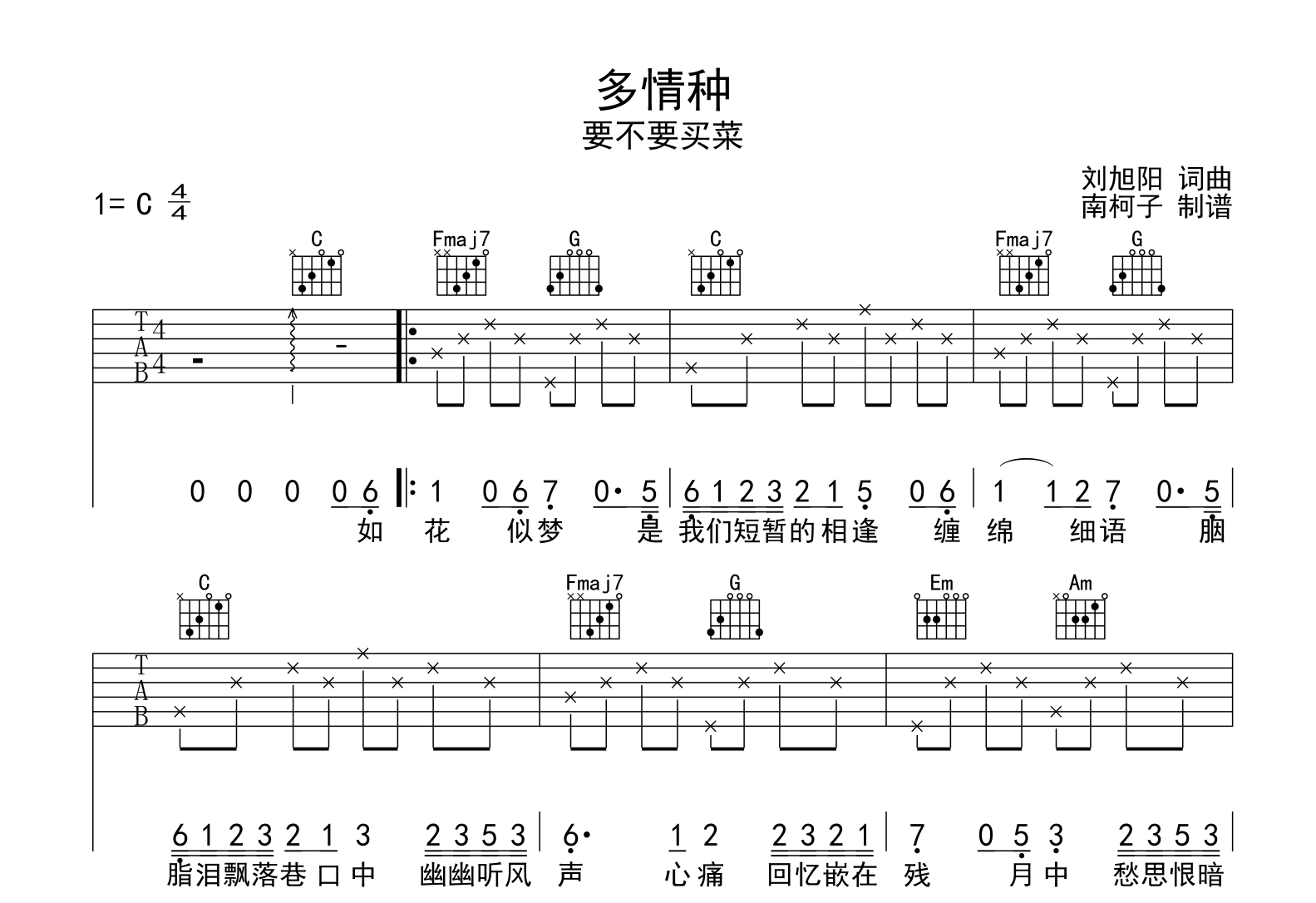 曲谱介绍: 多情种吉他谱,共2张高清图片谱,选用C调指法,变调夹夹一品弹唱原调#C,节奏4/4拍,速度85拍/每分钟,本谱由@南柯子制谱。