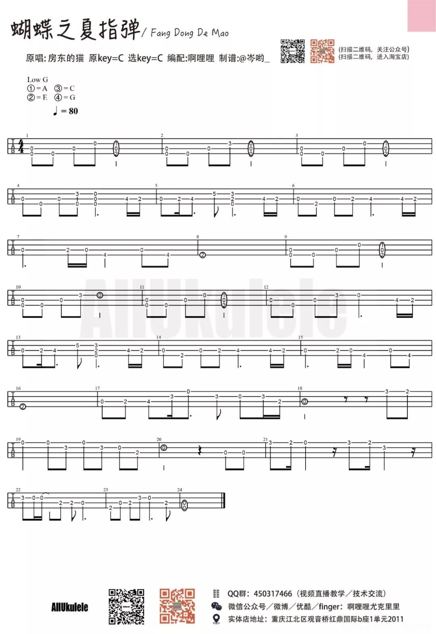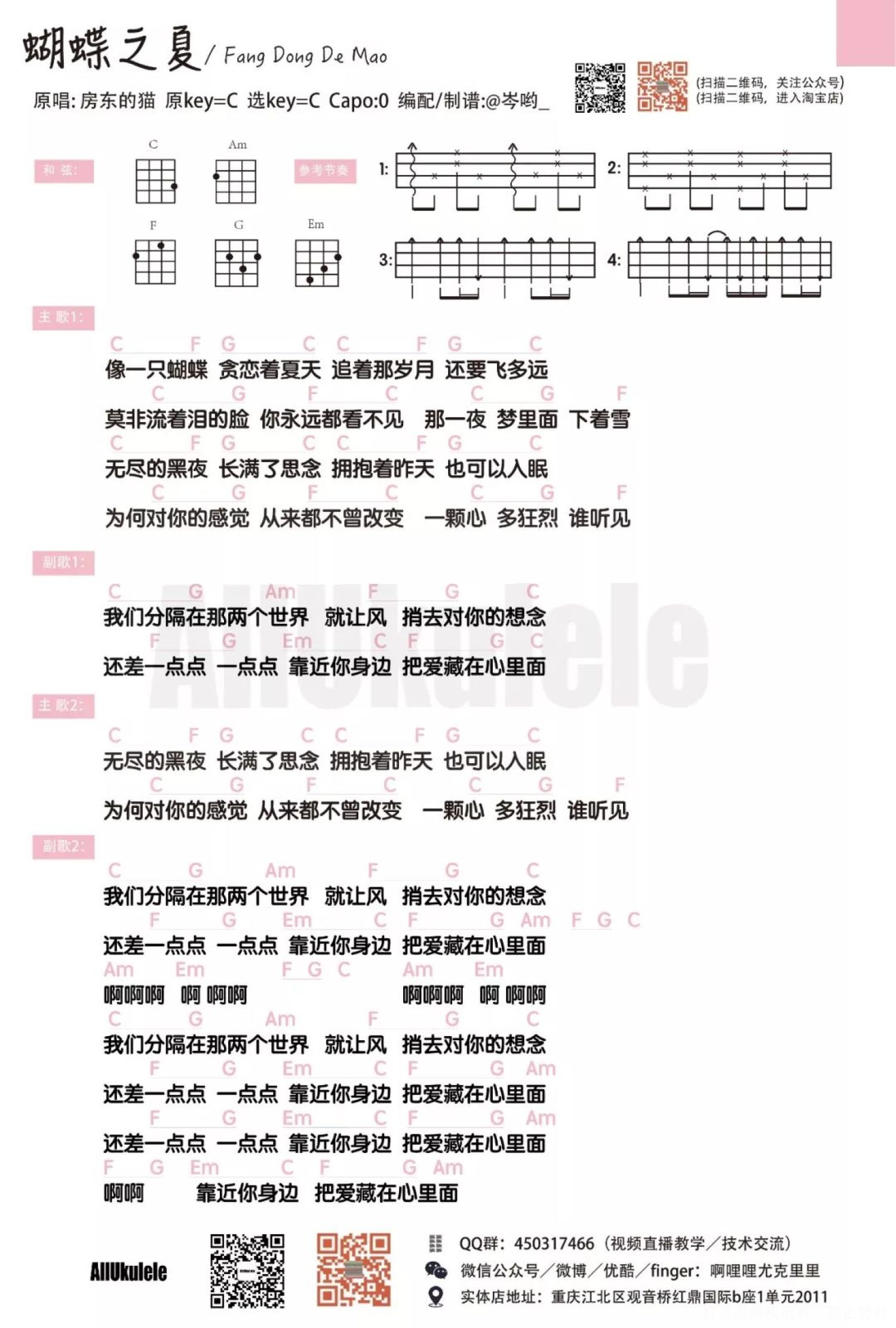 蝴蝶之夏尤克里里谱 - 房东的猫 - 弹唱教学+指弹