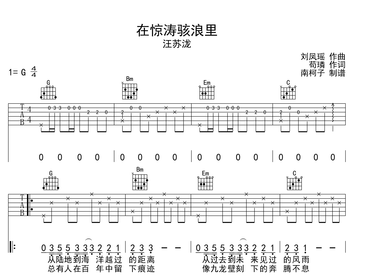 曲谱介绍: 在惊涛骇浪里吉他谱,共3张高清图片谱,选用G调和弦,变调夹夹4品,节拍4/4拍,速度90/分钟,包含完整的前奏,弹唱难度较简单,由制谱师@南柯子制谱。