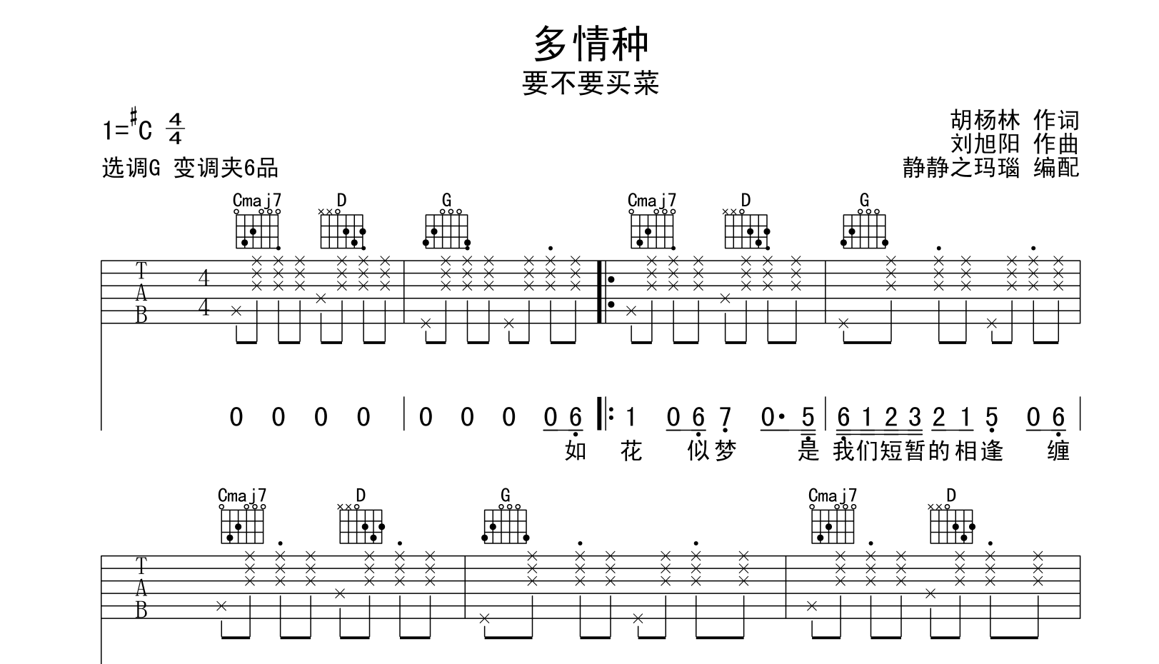 曲谱介绍: 要不要买菜《多情种》吉他谱,共2张图片谱,本谱采用G调和弦指法编配,弹唱建议变调夹夹6品,节奏为4/4拍,速度为58拍每分钟,也可以根据个人嗓音找到一个舒服的位置,弹唱难度较简单,谱子由@静静之玛瑙制谱。