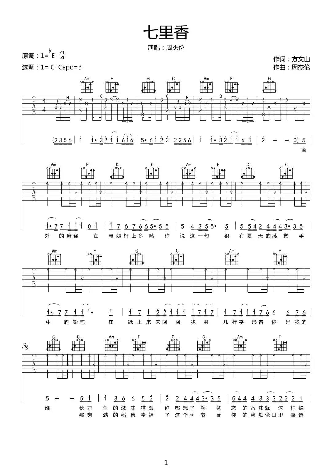 曲谱介绍: 周杰伦《七里香》吉他谱,总共2张图片谱,纯净版本编配,原调bE,选用C调指法,推荐夹3品弹唱,可根据演唱舒适感找合适的品位,包含完整的前奏+尾奏,弹唱节奏主要以扫弦贯穿全谱。