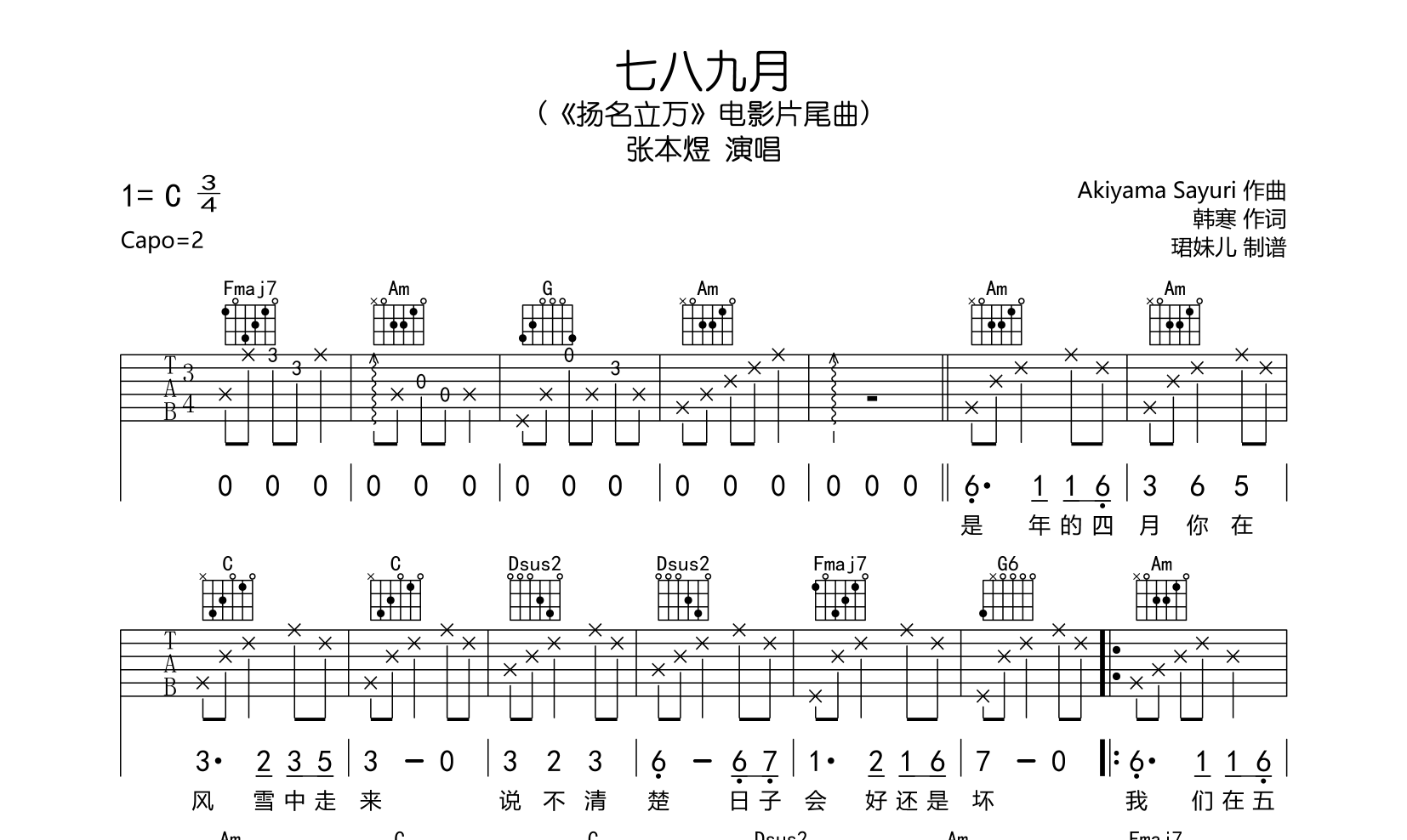 曲谱介绍: 七八九月吉他谱,张本煜演唱,共3张高清图片谱,采用C调指法编配,弹唱建议变调夹2品,速度85BPM,包含完整的前奏还原度不错,弹唱难度较简单。