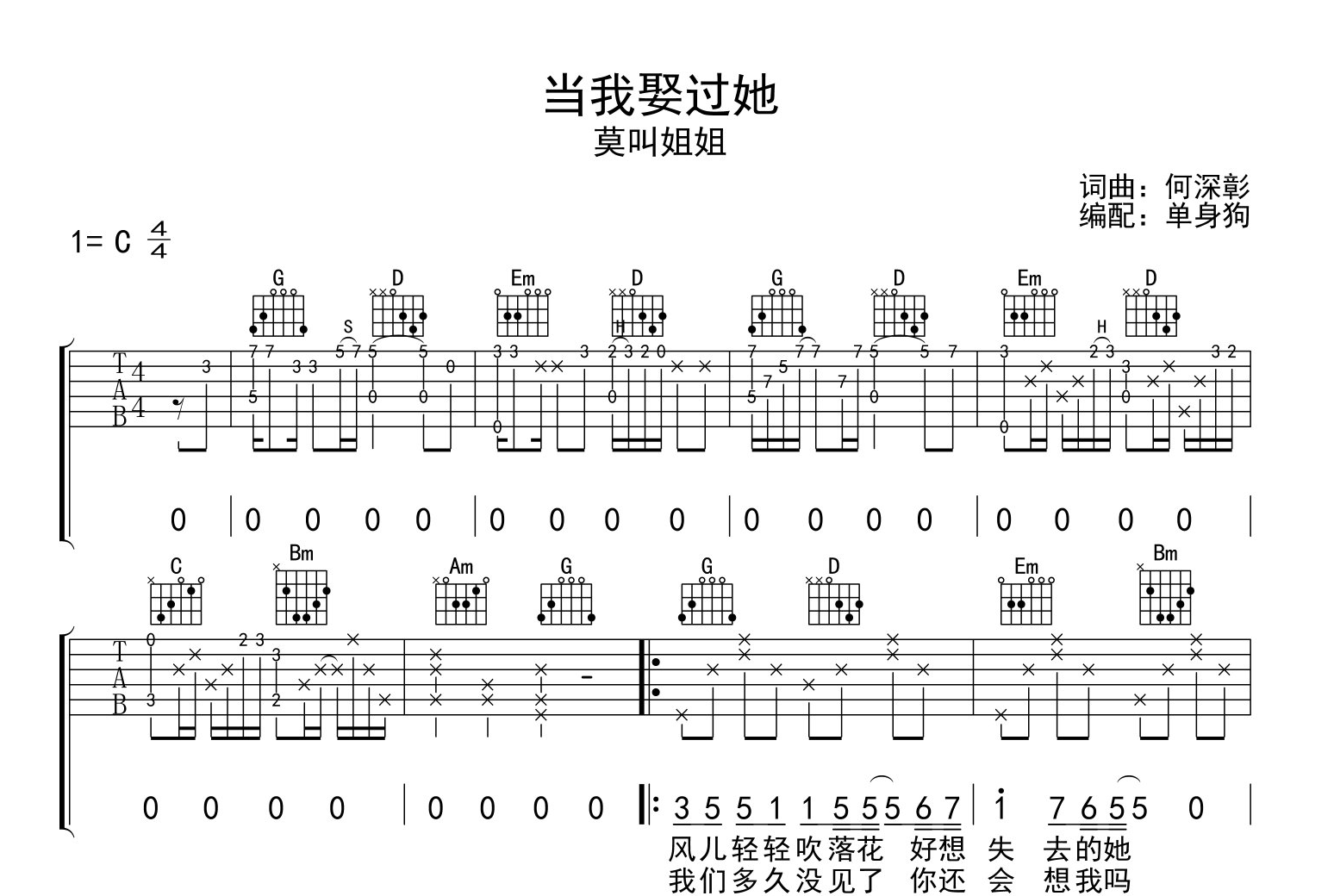 曲谱介绍: 当我娶过她吉他谱,莫叫姐姐演唱,来自创作者单身狗的制谱,选用C调指法,可根据自己音域条件调整遍地哦啊接,包含完整的前奏部分还原度较高,弹唱较为简单。