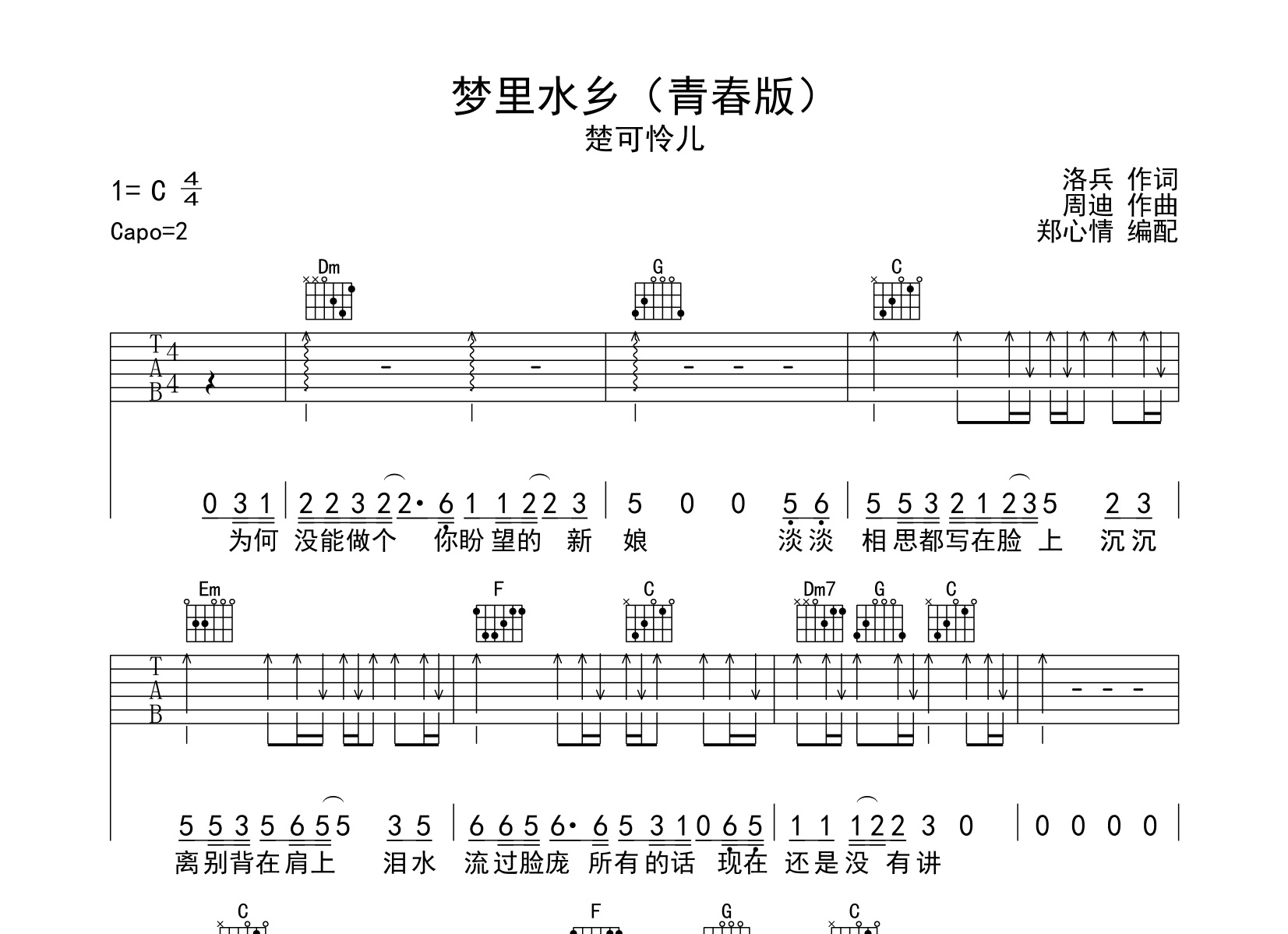 曲谱介绍: 梦里水乡吉他谱,楚可怜儿(青春版),由创作者郑心情制谱,共2张高清图片谱,C调指法编配,夹2品为原调D调,节奏4/4拍,弹唱难度较简单。