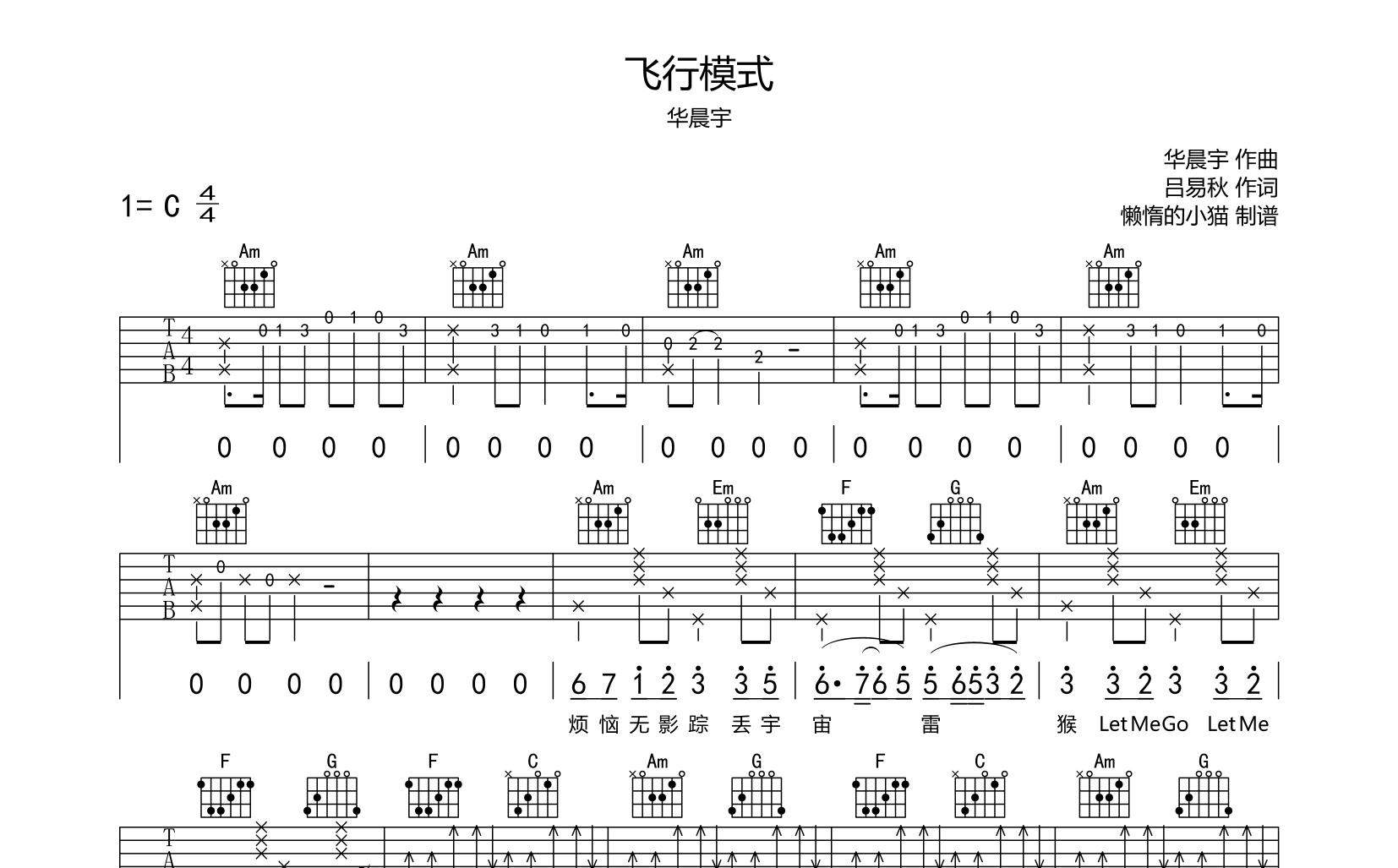曲谱介绍: 飞行模式吉他谱,华晨宇原唱,由创作者懒惰的小猫制谱,共3张高清图片谱,原调为C调,使用C调指法弹唱,节奏4/4,速度每分钟110拍,按原版编配包含完整前奏,难度较简单。