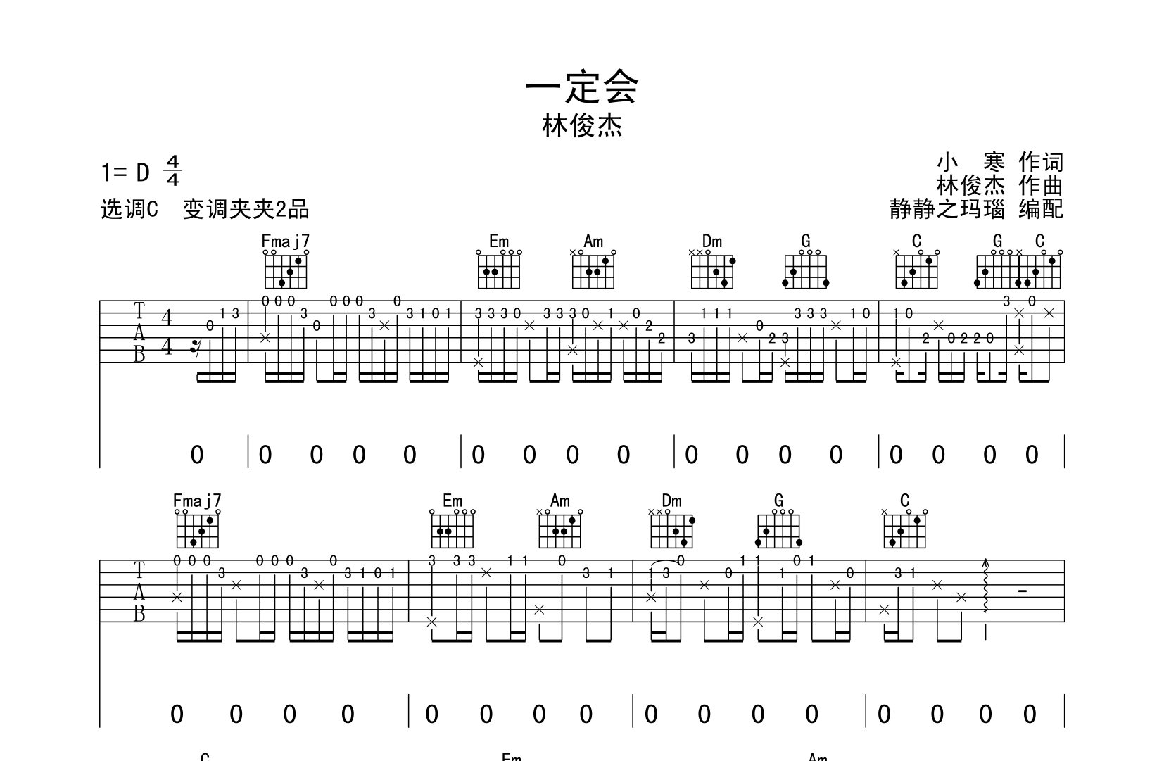 曲谱介绍: 一定会吉他谱,林俊杰新歌,由静静之玛瑙制谱,本谱采用C调和弦指法编配,弹唱建议变调夹夹2品,也可以根据个人嗓音找到一个舒服的位置,节奏为4/4拍,速度为90拍每分钟,难度初级。