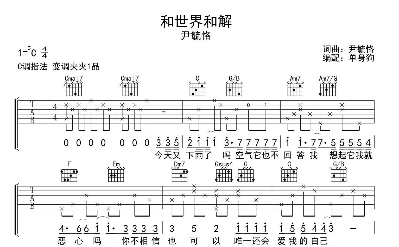 曲谱介绍: 和世界和解吉他谱,尹毓恪版本,由创作者单身狗制谱,共3张高清图片谱,原调#C,选用C调指法,变调夹夹1品弹唱原调,节奏4/4拍,难度较简单。