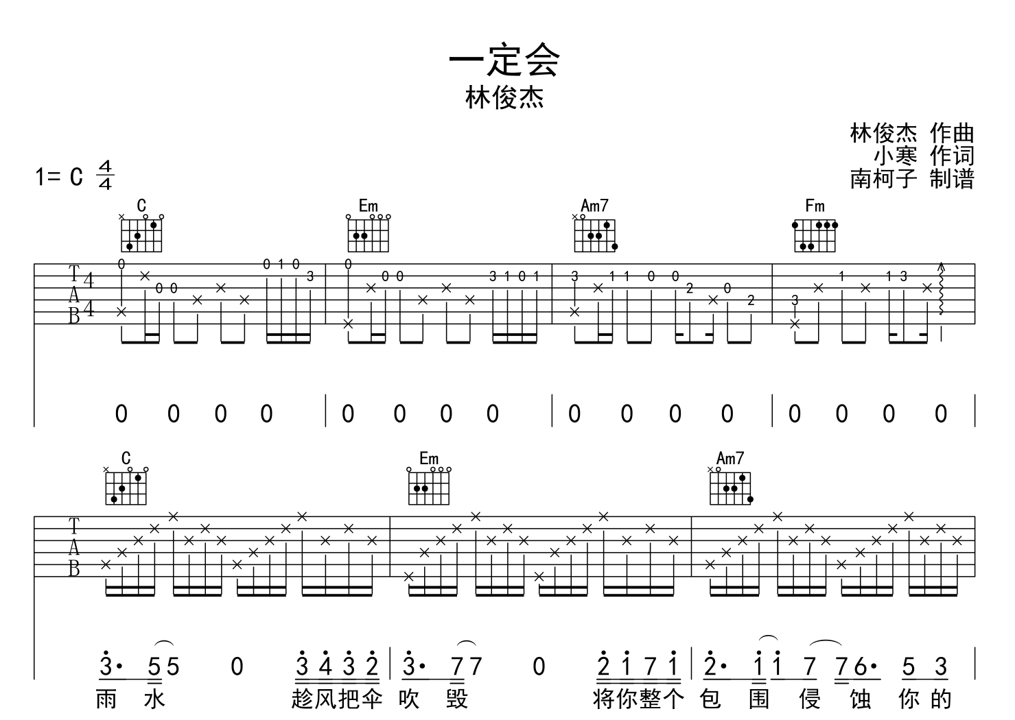 曲谱介绍: 一定会吉他谱,林俊杰新歌,由创作者南柯子制谱,选用C调和弦编配,变调夹夹2品弹唱原调,节奏4/4拍,速度90拍每分钟,按原版完整编配包含前奏,难度较简单。