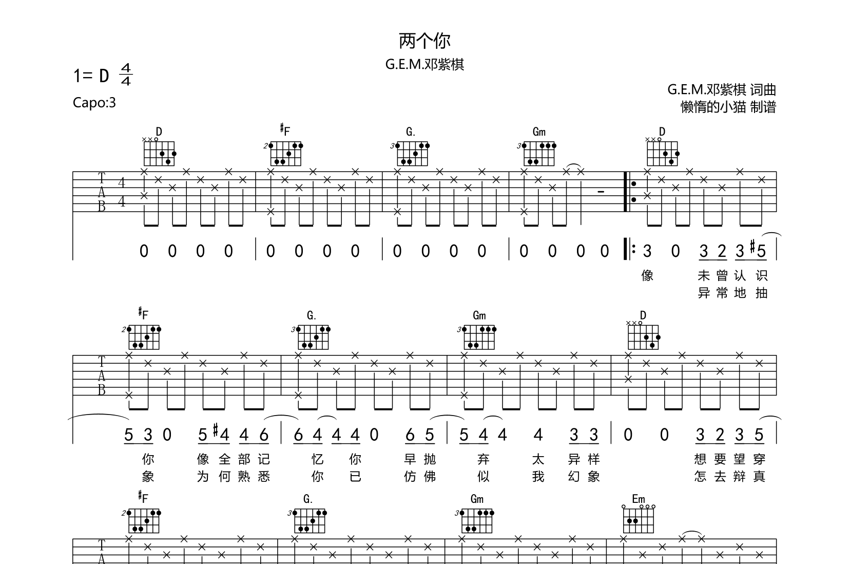 曲谱介绍: 两个你吉他谱,邓紫棋版,共2张图片谱,由懒惰的小猫制谱,原调为F调,使用D调指法编配,变调夹三品为原调,速度:90-93 每分钟,包含前奏,难度较简单。
