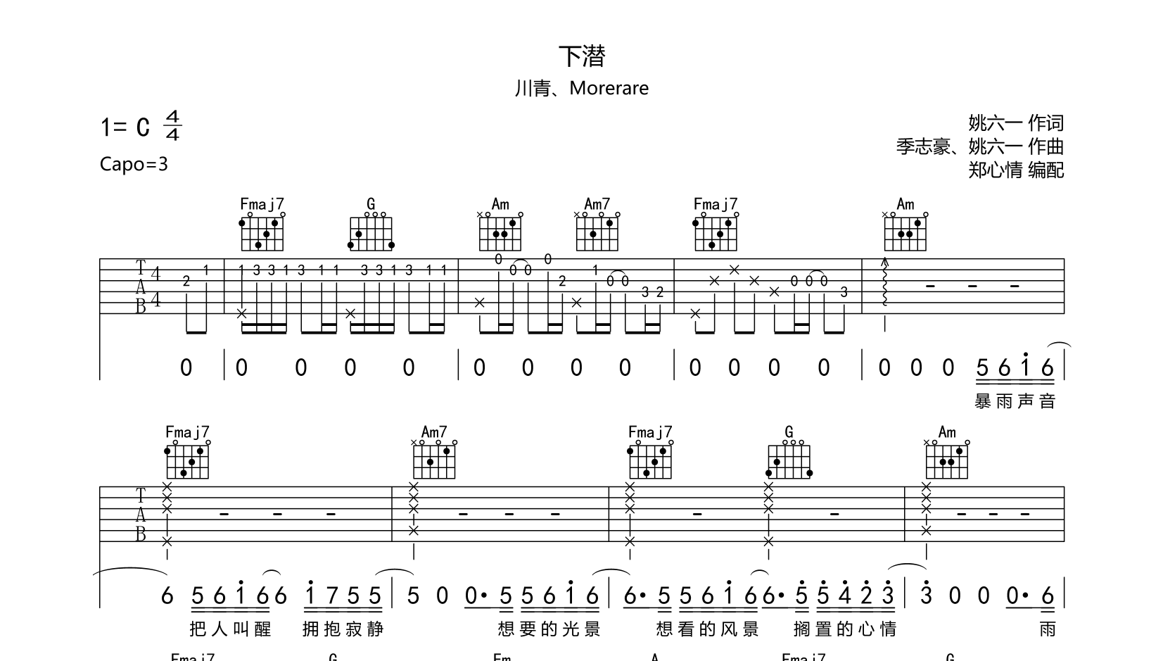 曲谱介绍: 下潜吉他谱,由创作者郑心情制谱,共3张高清图片谱,C调指法编配,变调夹夹3品为原调,包含完整前奏按原版编配,弹唱较简单。